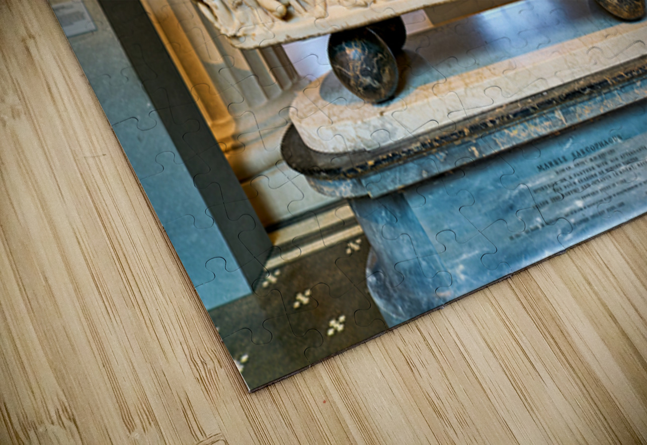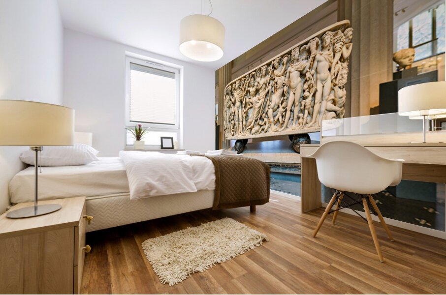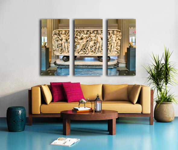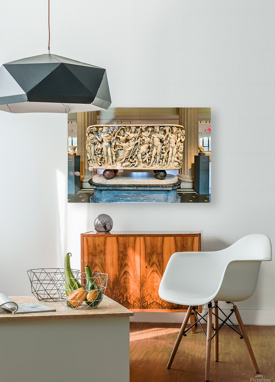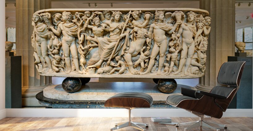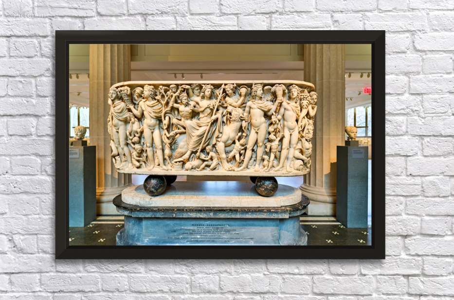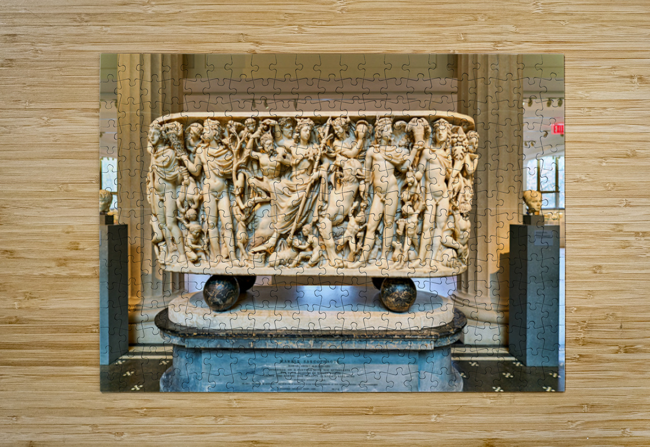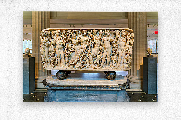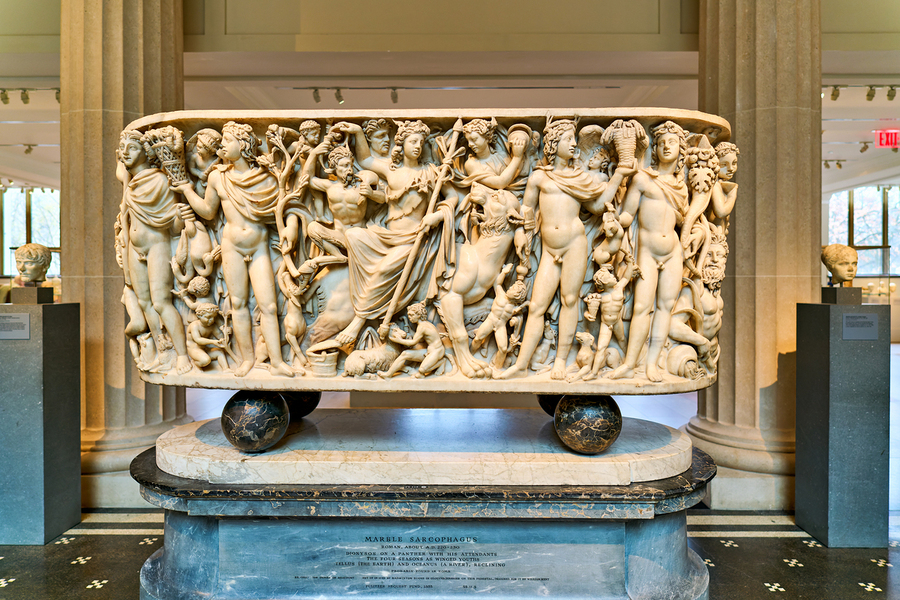 The Roman marble sarcophagus is located in the Greek and Roman Galleries of the Metropolitan Museum of Art in Manhattan. Visitors view the artwork.
