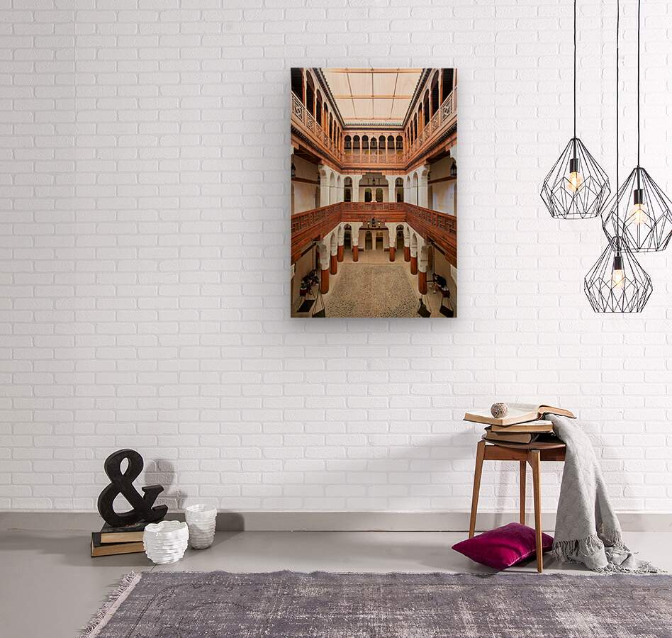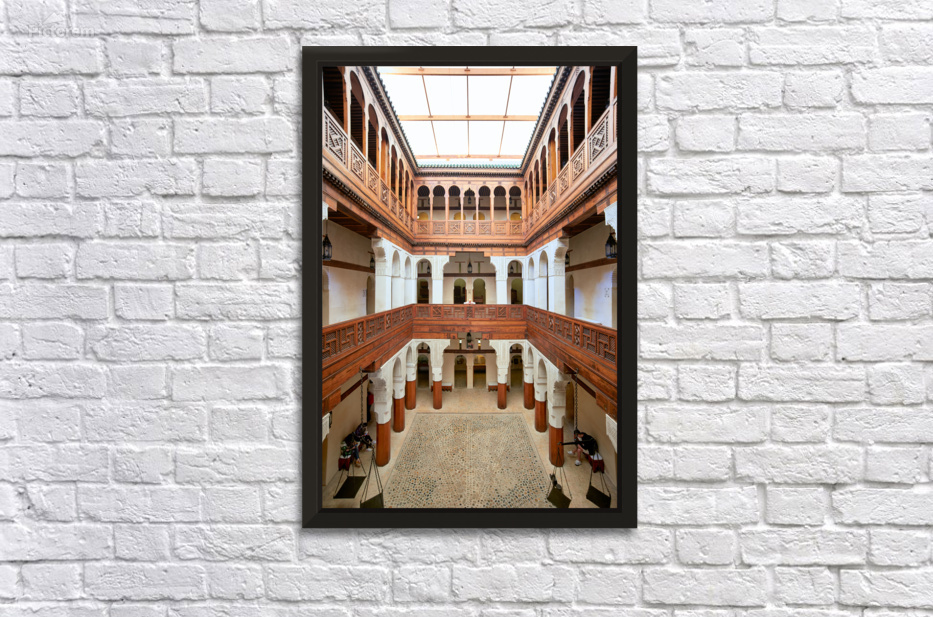 Visitors explore the Nejjarine Fondouk Museum a space that displays wood arts and crafts in Fez Morocco. The architecture showcases local culture.