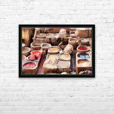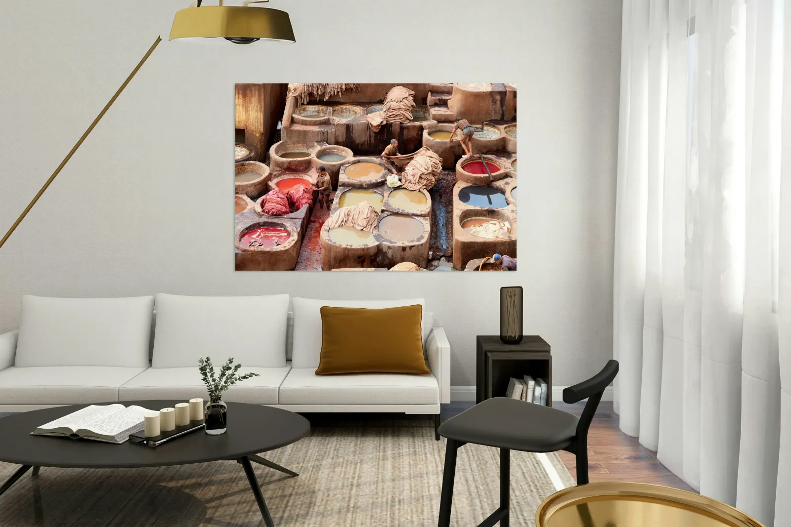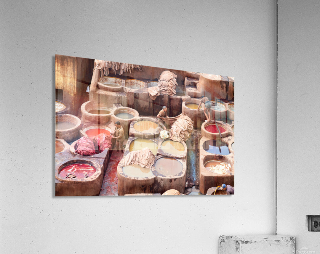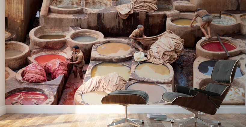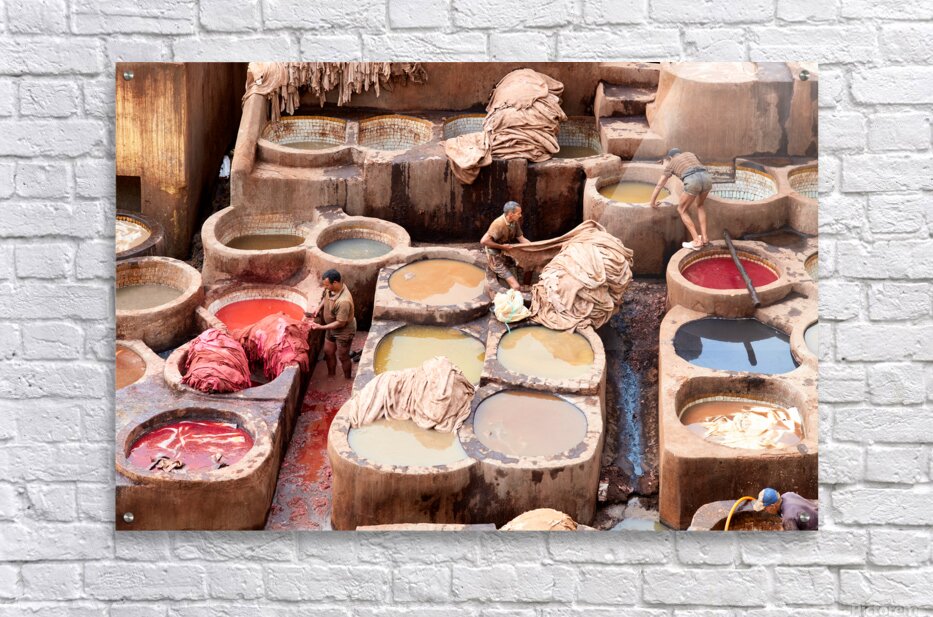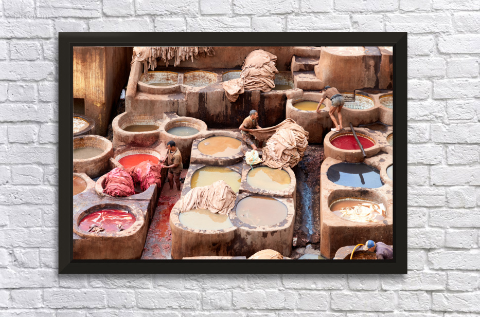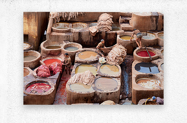 People are dyeing leather in large vats at Chouara Tannery in Fez Morocco. The area shows various colors and fabrics.