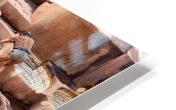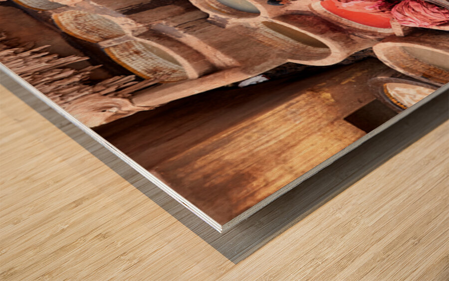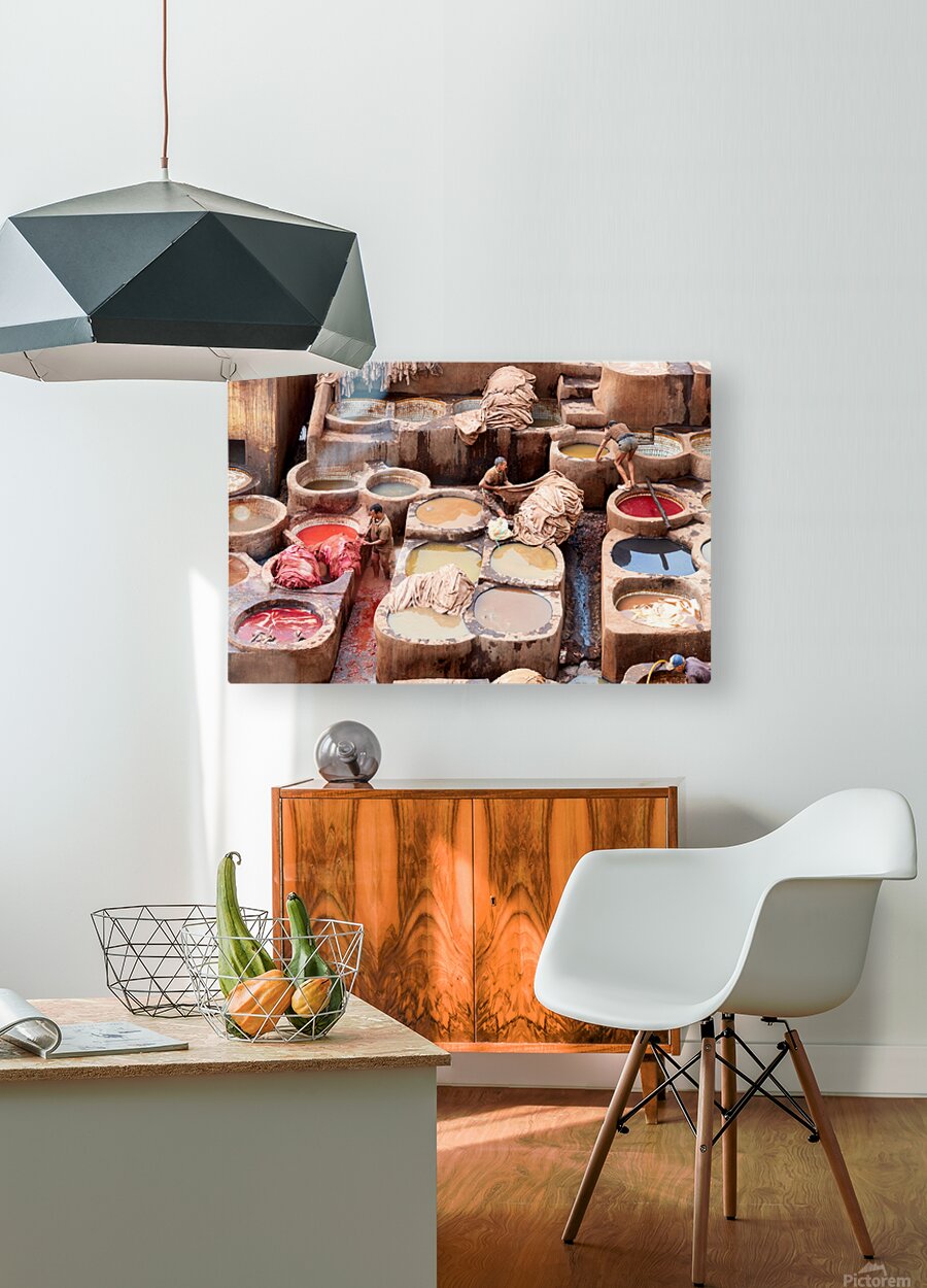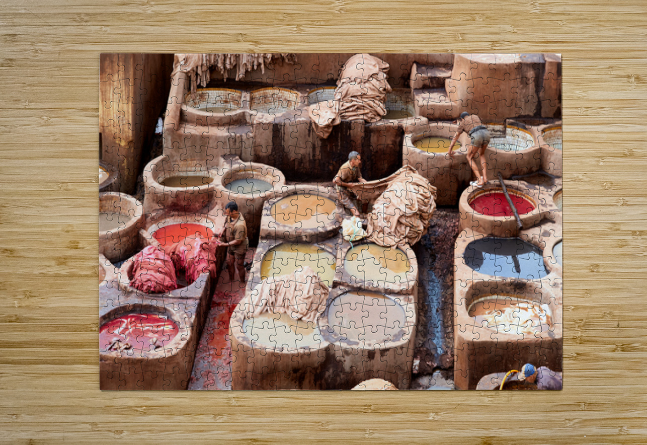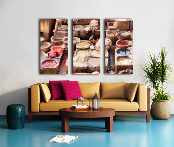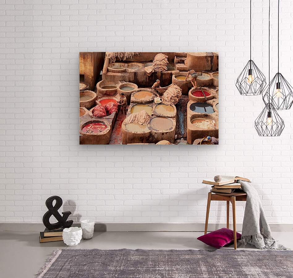 People are dyeing leather in large vats at Chouara Tannery in Fez Morocco. The area shows various colors and fabrics.