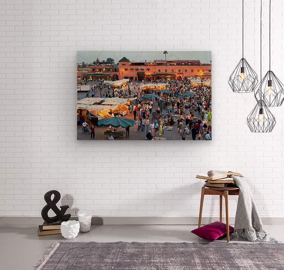 People gather in Djema el Fna square as food stalls set up at sunset in Marrakesh creating a lively atmosphere with market activities.