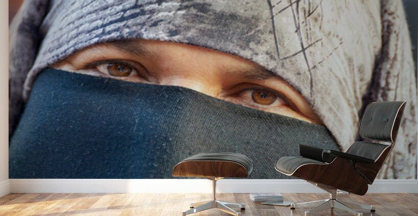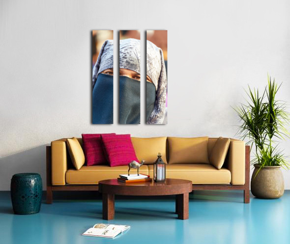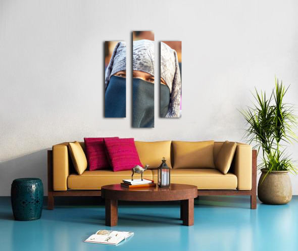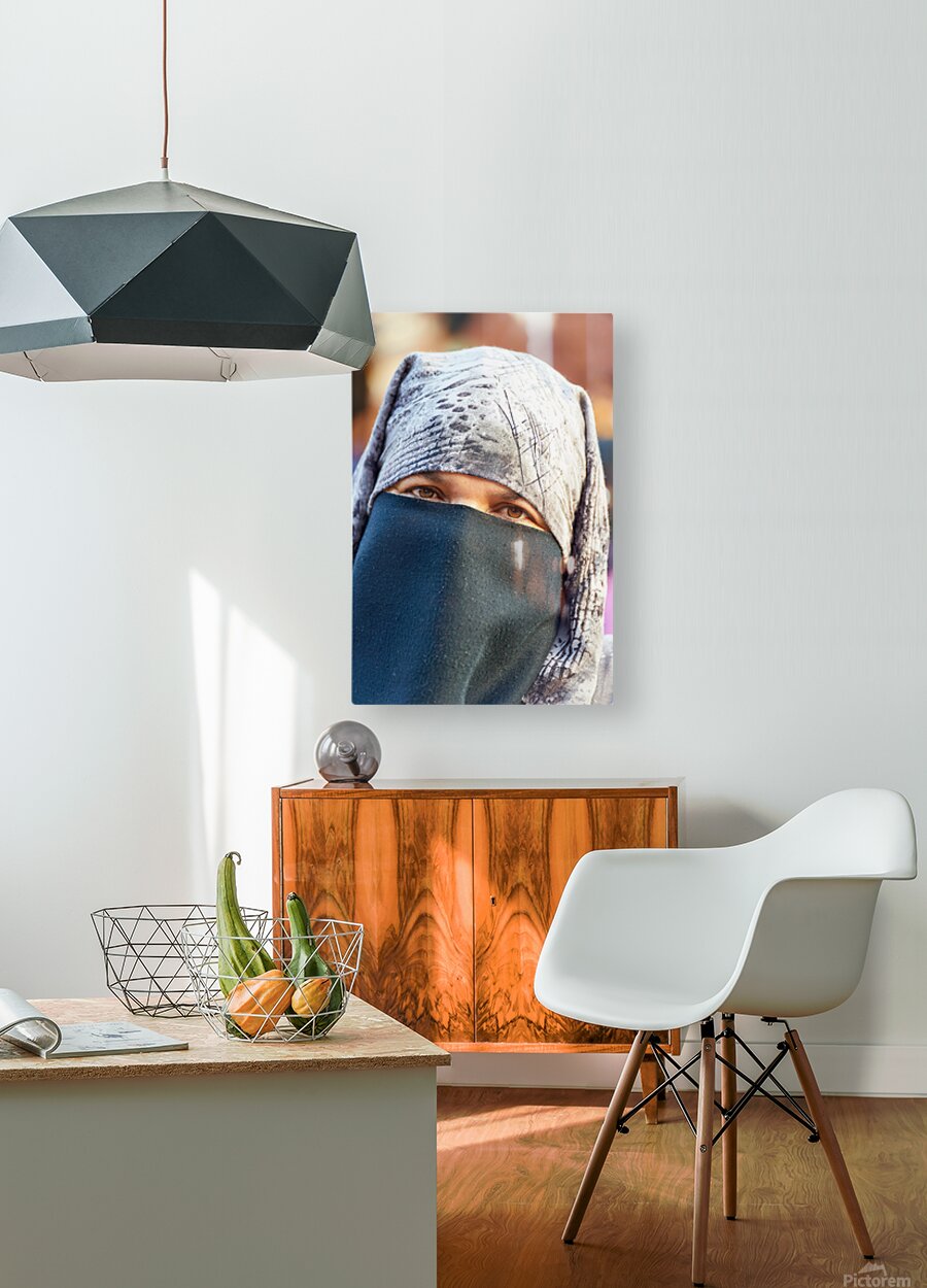 SUR CETTE OEUVRE: VEILED MOROCCAN WOMAN IN MARRAKESH MARKET ON A SUNNY DAY
