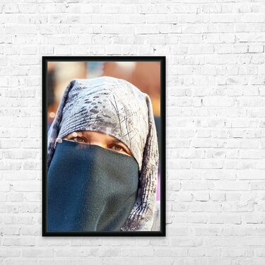 Veiled Moroccan woman in Marrakesh market on a sunny day Impression du cadre