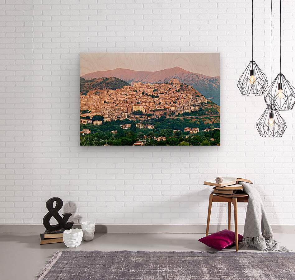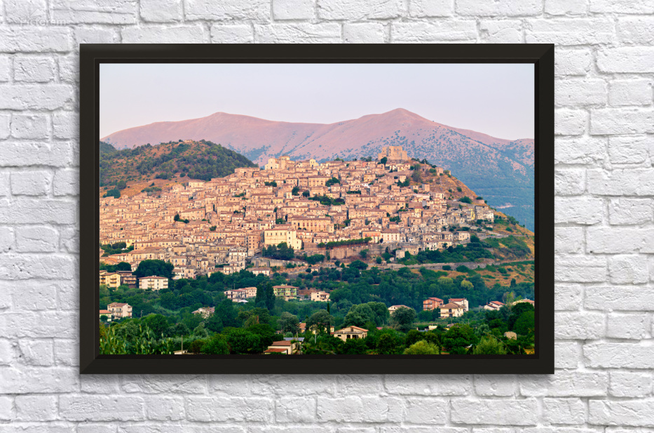 Sunrise casts light on Morano Calabro showing buildings and hills in this scenic view of the town located in Calabria Italy.