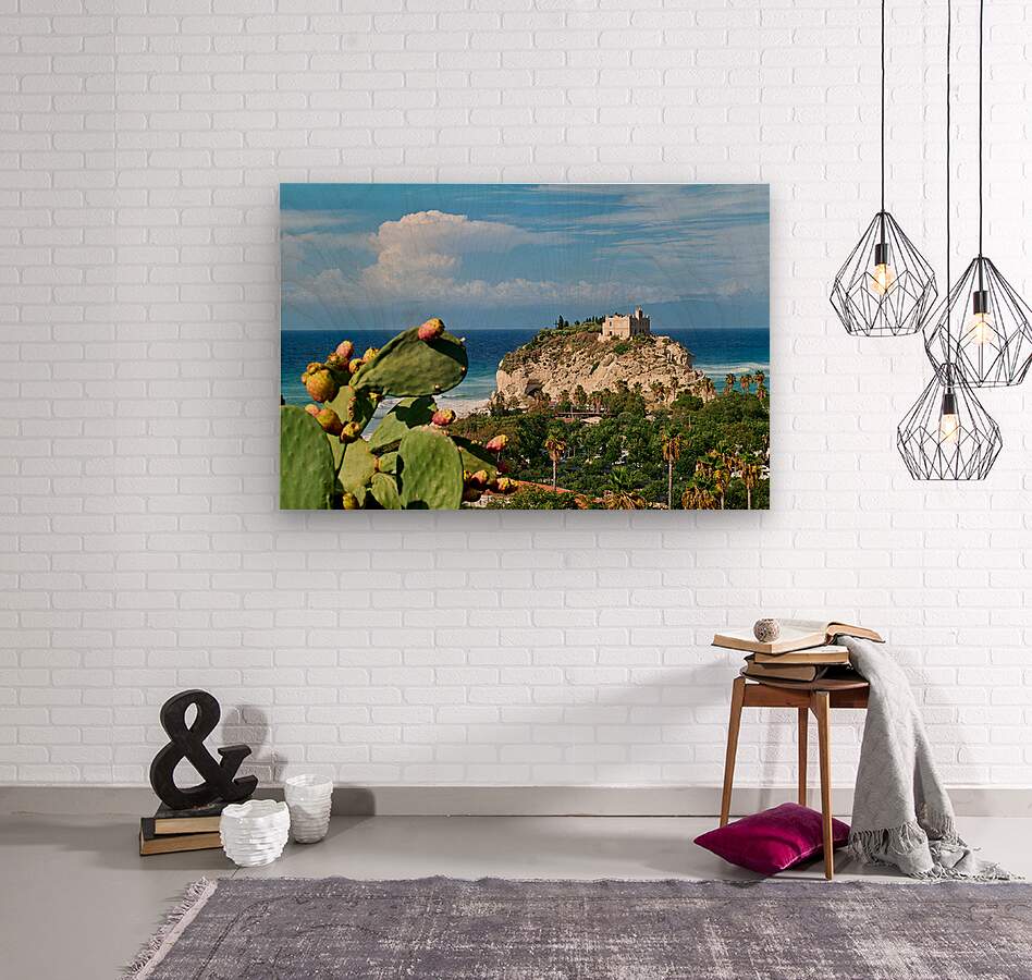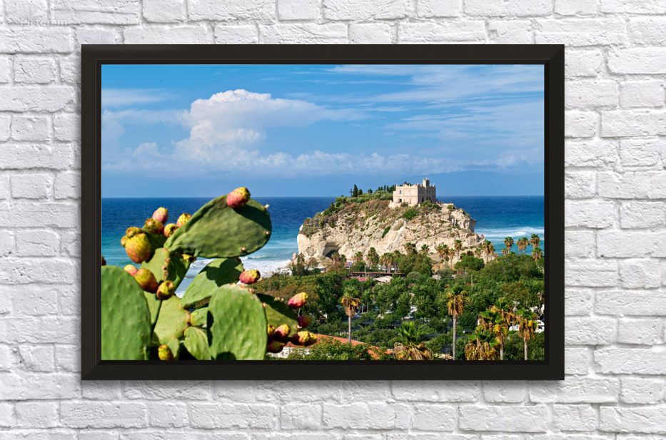 Santa Maria dellIsola Monastery sits atop a cliff in Tropea. The sea and plants surround this historic site on a sunny day.