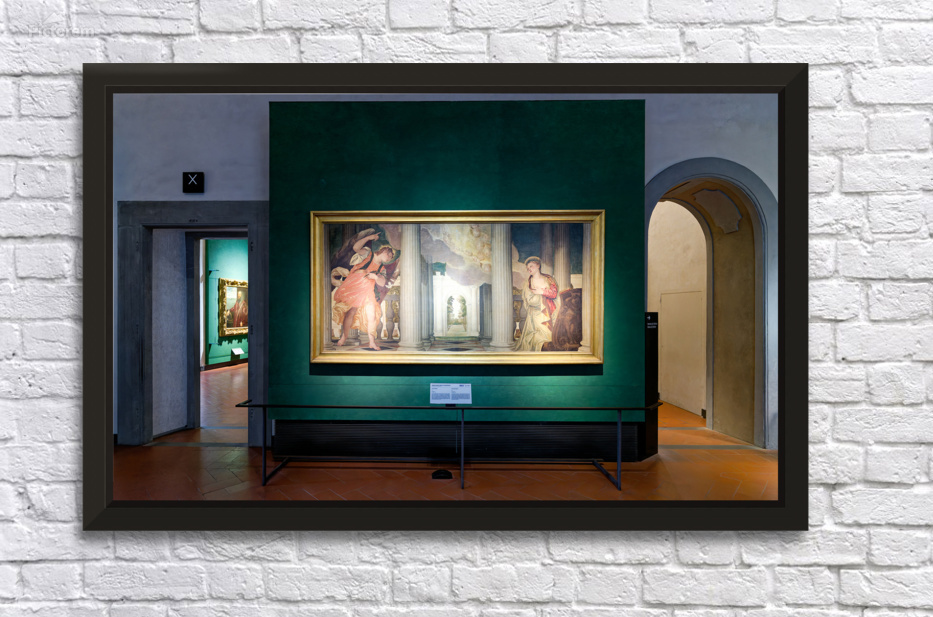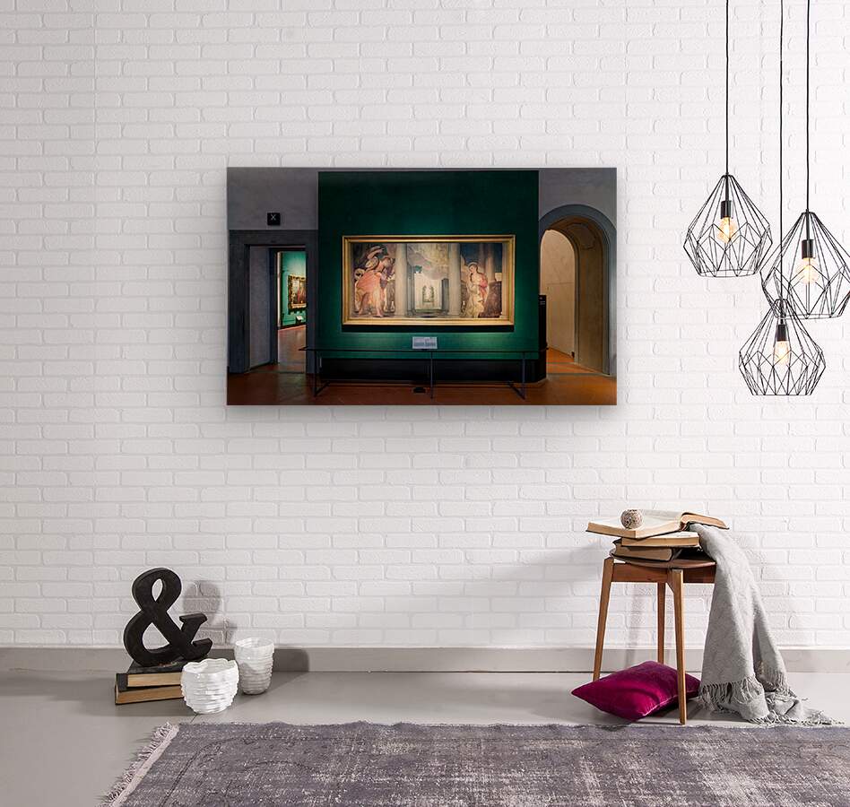 Visitors view Veroneses Annunciation at the Uffizi Gallery in Florence Tuscany Italy. The artwork captures a religious moment in a classic setting.