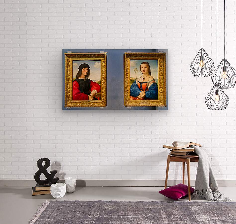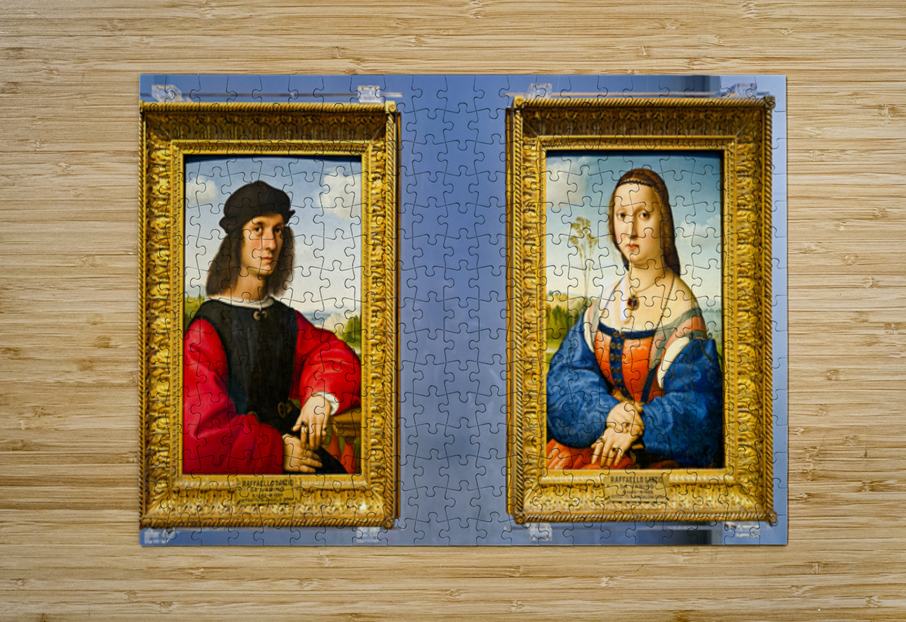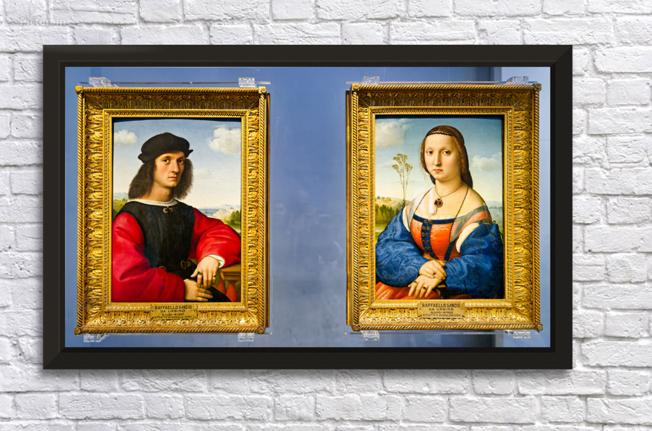Visitors see portraits of Angelo Doni and Maddalena Doni at Uffizi Gallery in Florence Tuscany Italy. These artworks show Renaissance style.