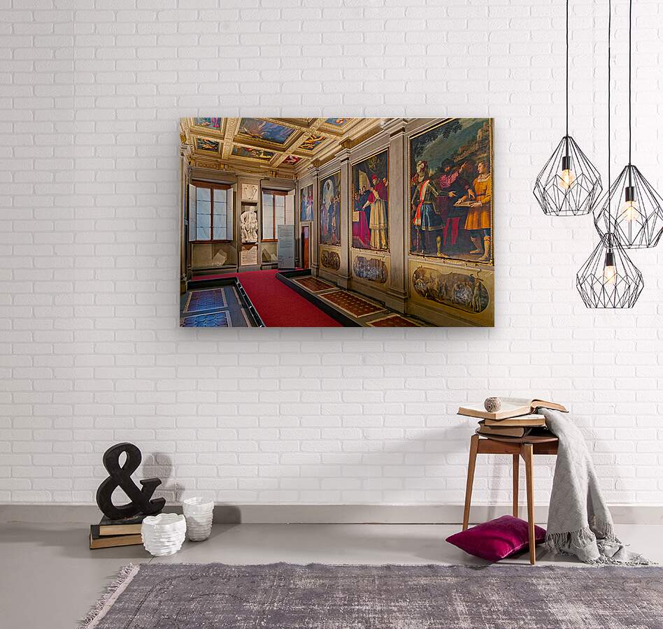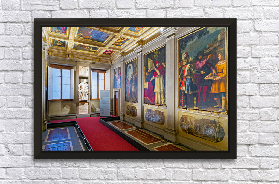 Visitors walk through Casa Buonarroti in Florence Tuscany. The gallery shows many artworks and historical structures.