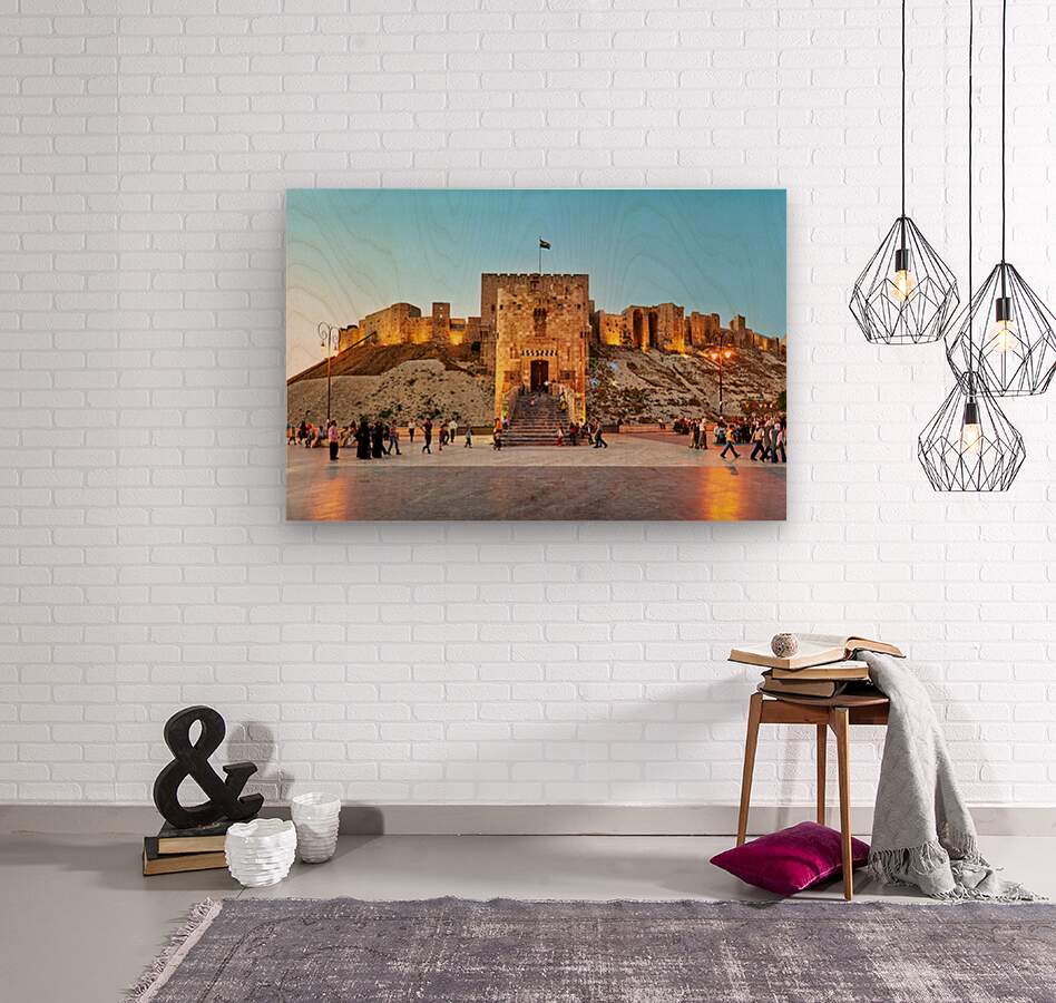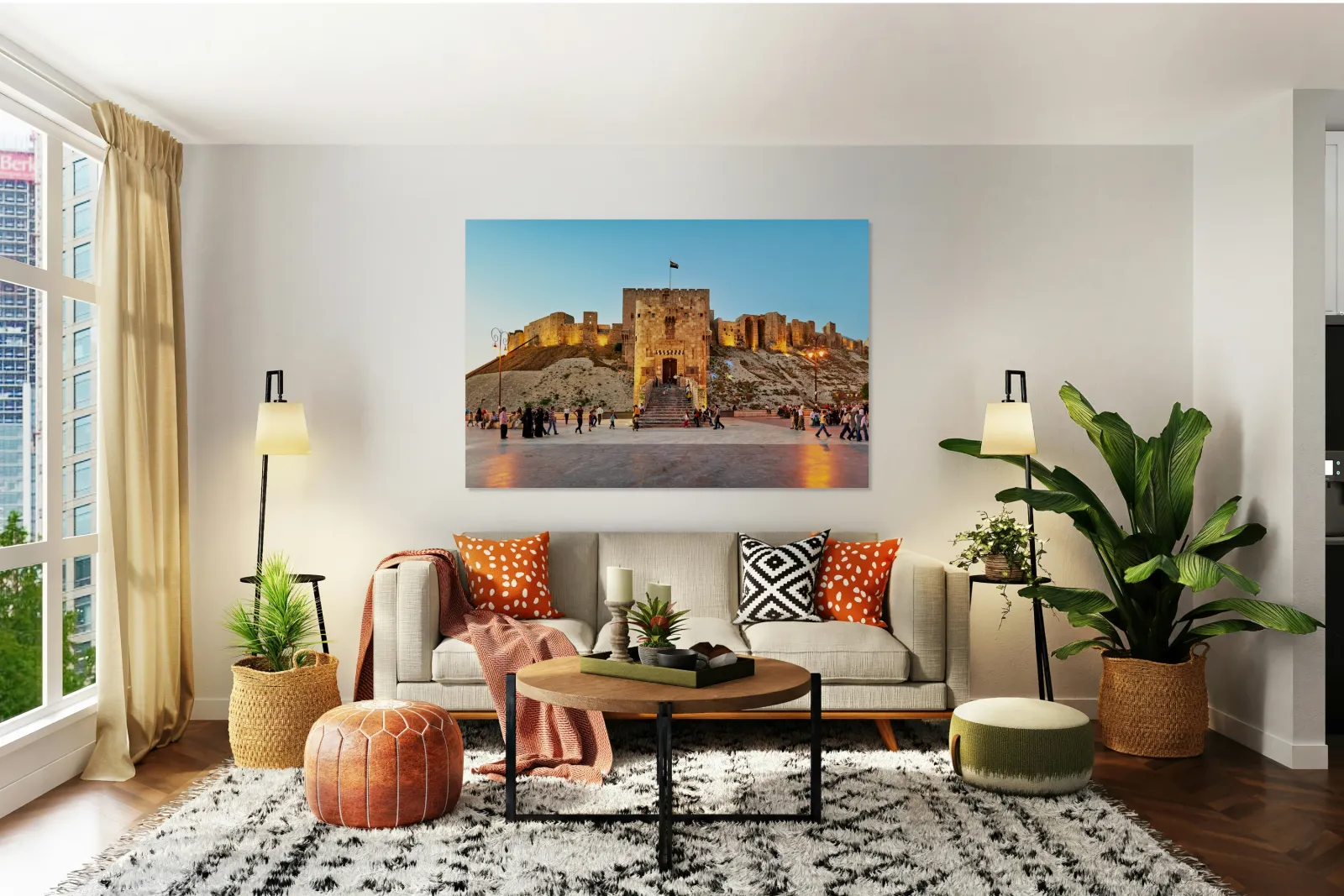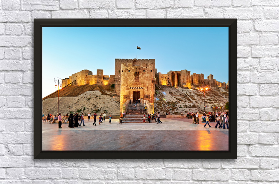 Visitors walk around the citadel of Aleppo as dusk sets in. The historic site stands tall illuminated against the evening sky.