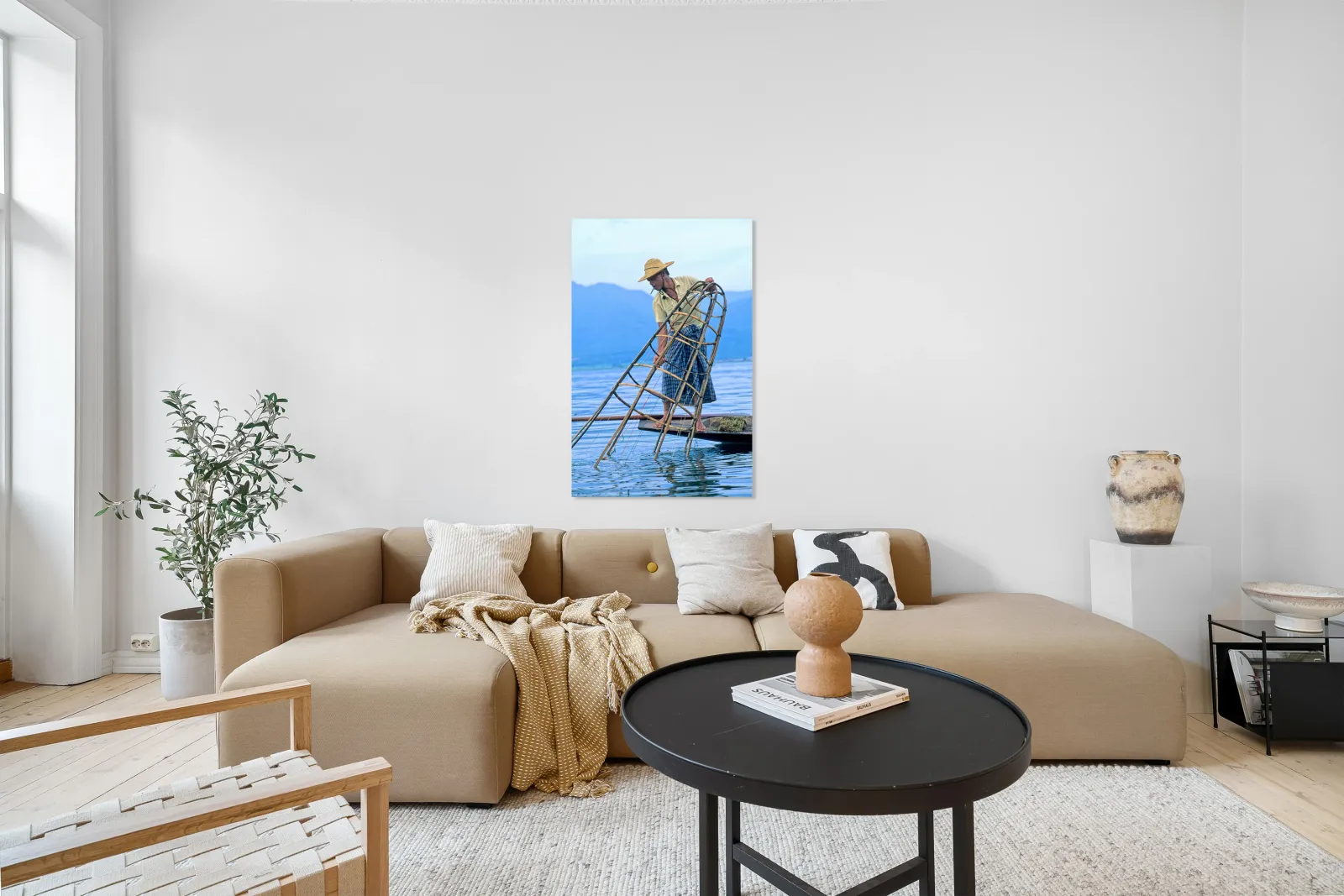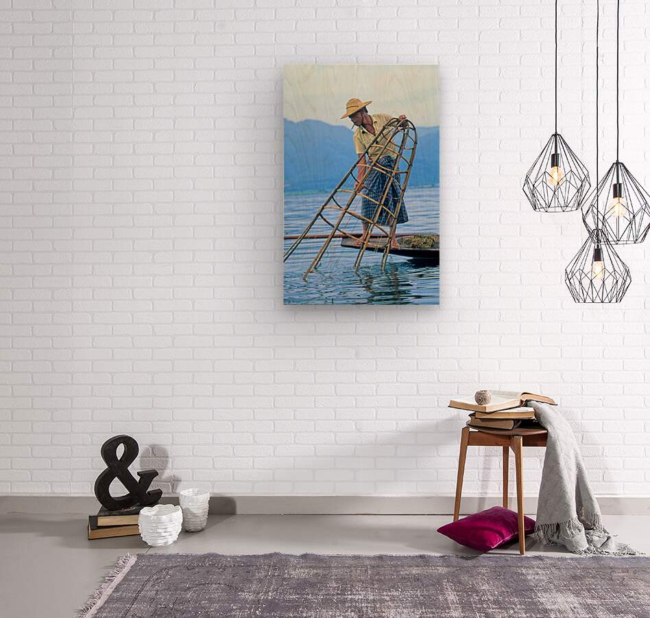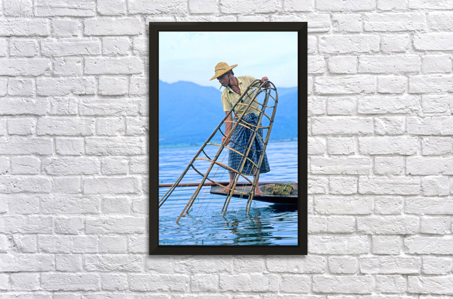 "Fishing on Inle Lake in Myanmar with bamboo tools" dans une impression encadrée.