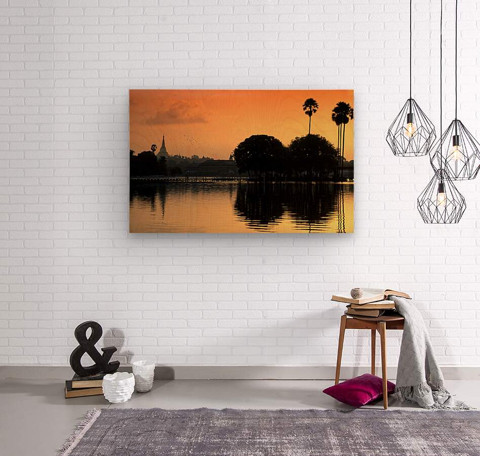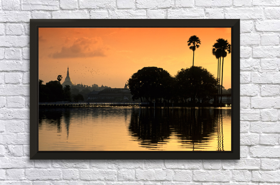 The sun sets over the water in Yangon. Silhouettes of palm trees and buildings create a scene at dusk. Reflections shimmer on the surface.