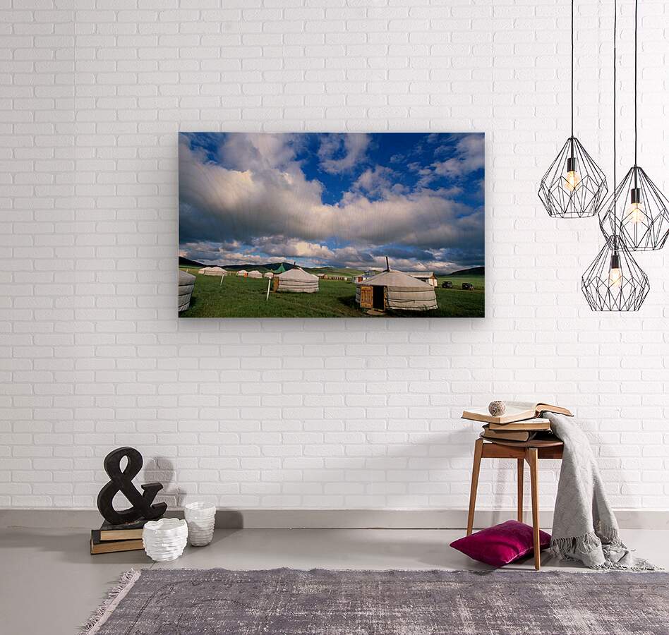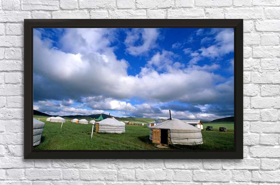 A camp of ger in the grassland of Mongolia. Many tents are set up under a cloudy sky.