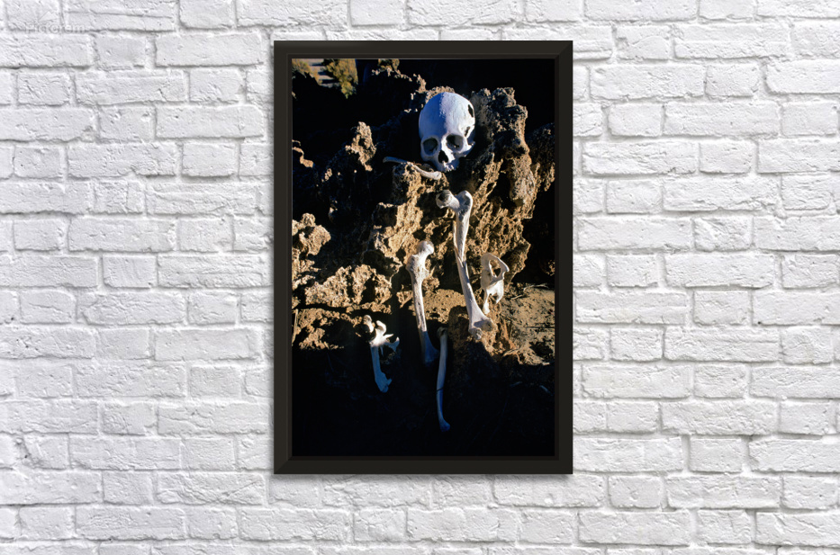 A human skeleton featuring a skull and various bones lies partially exposed in rocky sunlit terrain. The scene suggests an archaeological discovery or