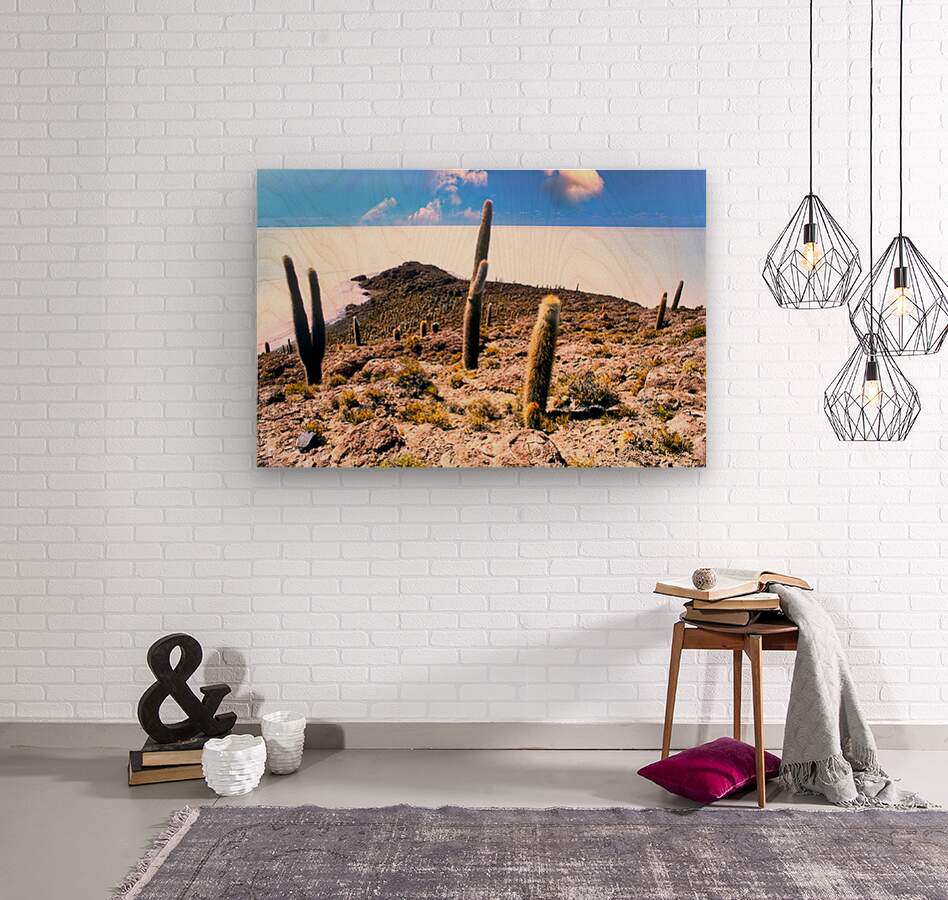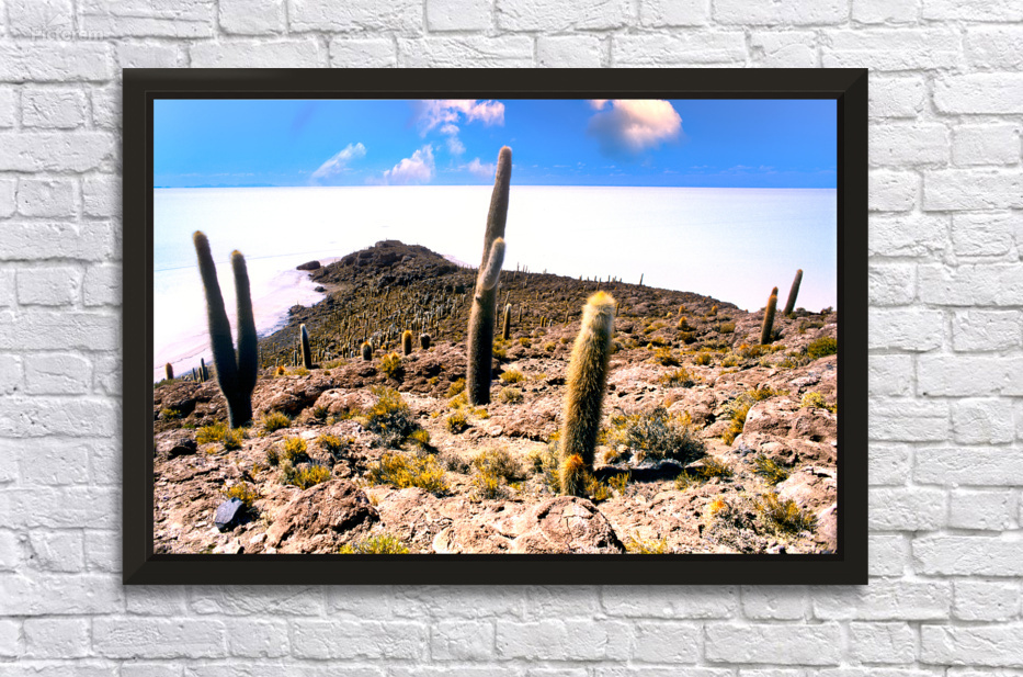 "Cactus island in a vast white salt flat under blue sky." dans une impression encadrée.