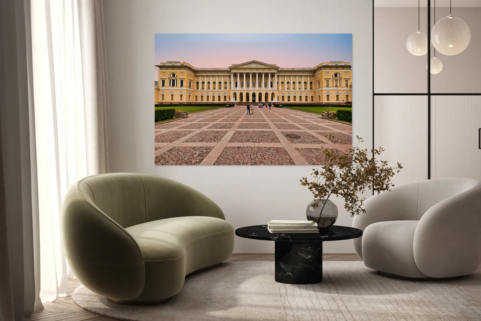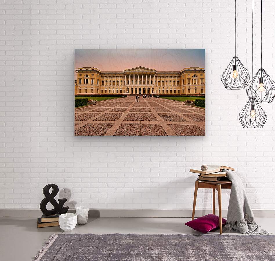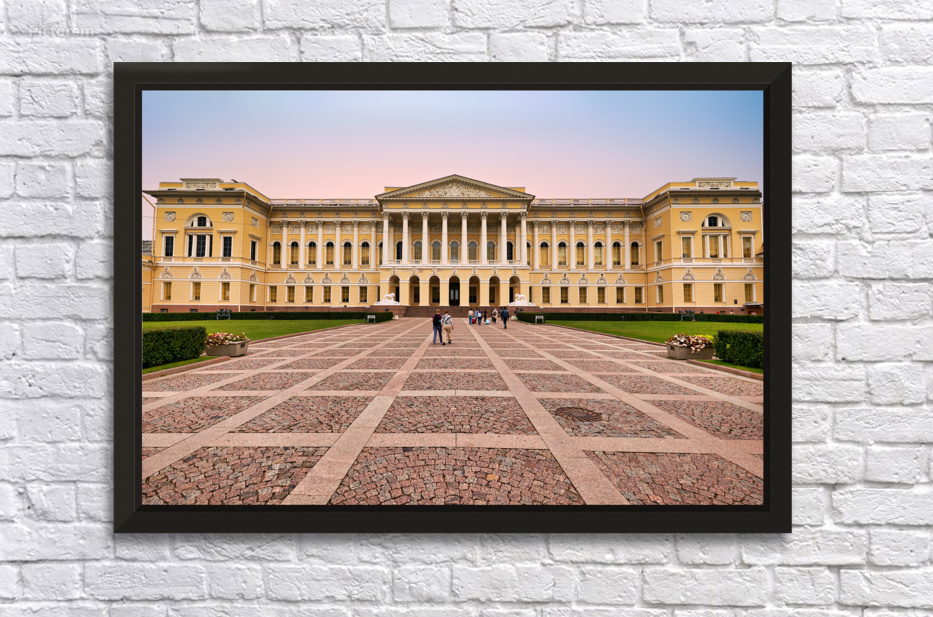 People walk towards the Russian Museum in Saint Petersburg. The building shows classic architecture and visitors admire its design.