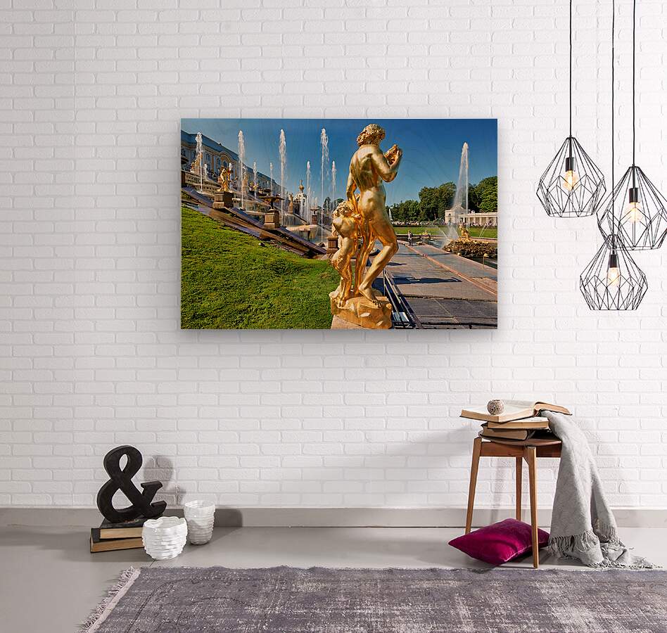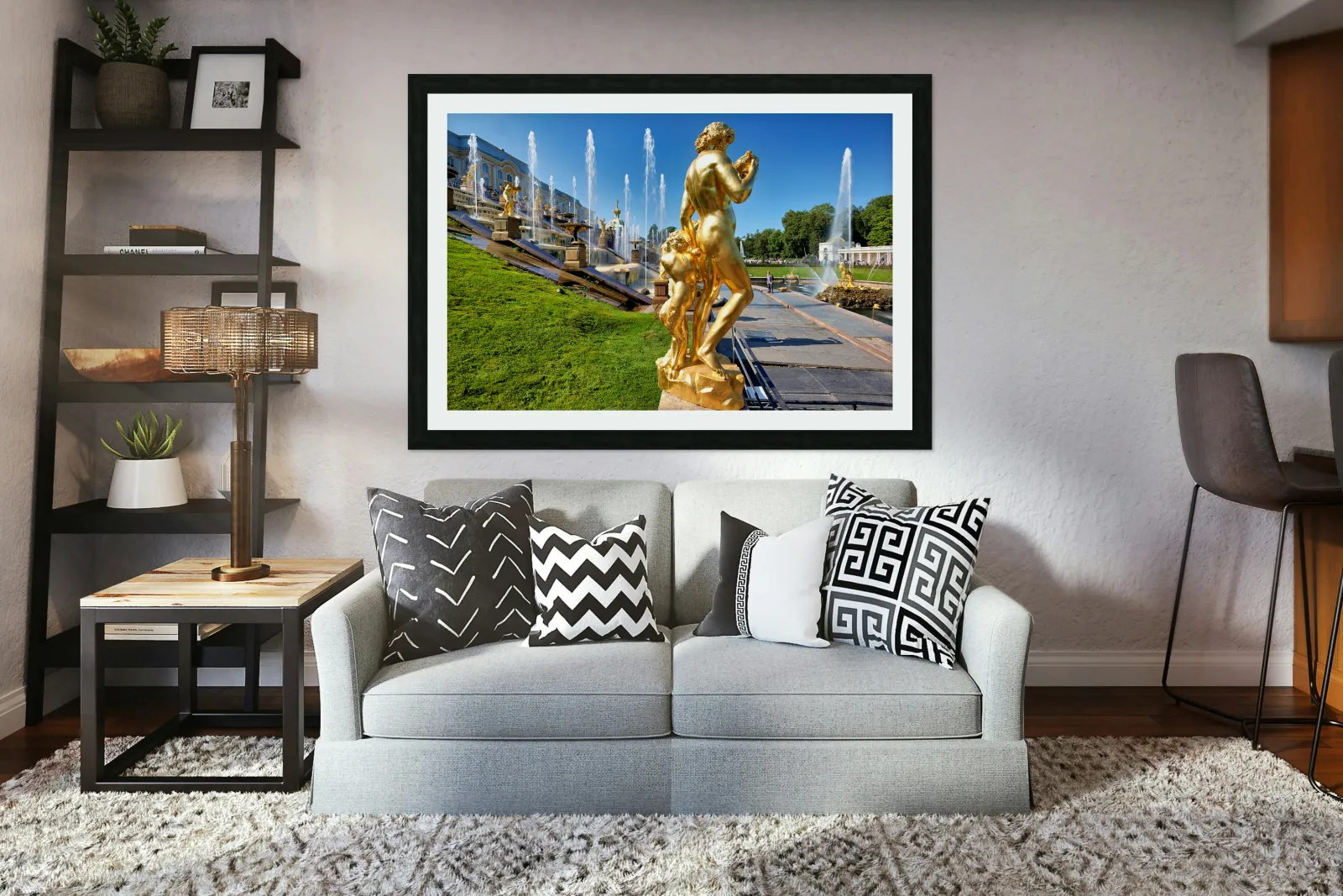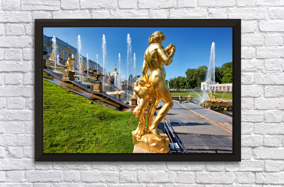 Golden statues stand near fountains at Peterhof Palace in St. Petersburg. Visitors enjoy the view on a sunny day in this historic location.