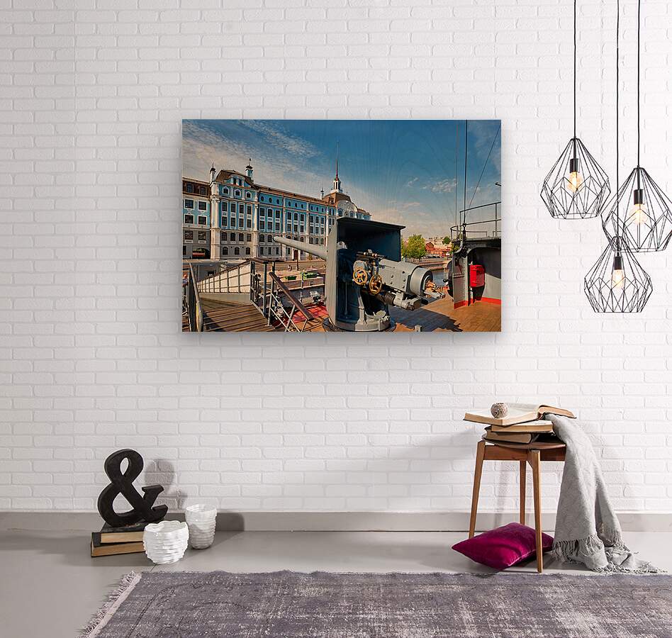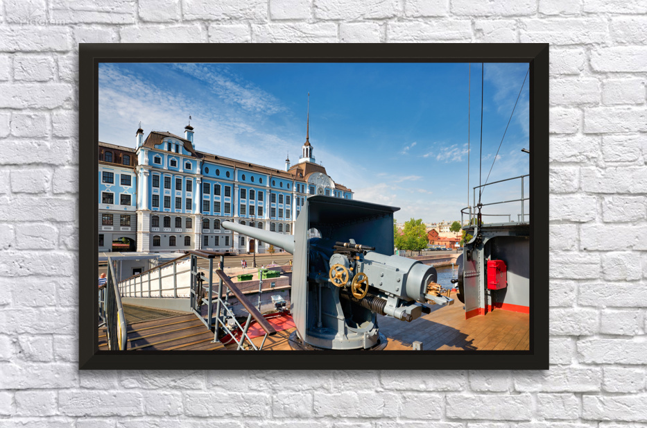 Cruiser Aurora stands in St. Petersburg showing its historical guns and the city buildings behind. The sky is clear and blue.