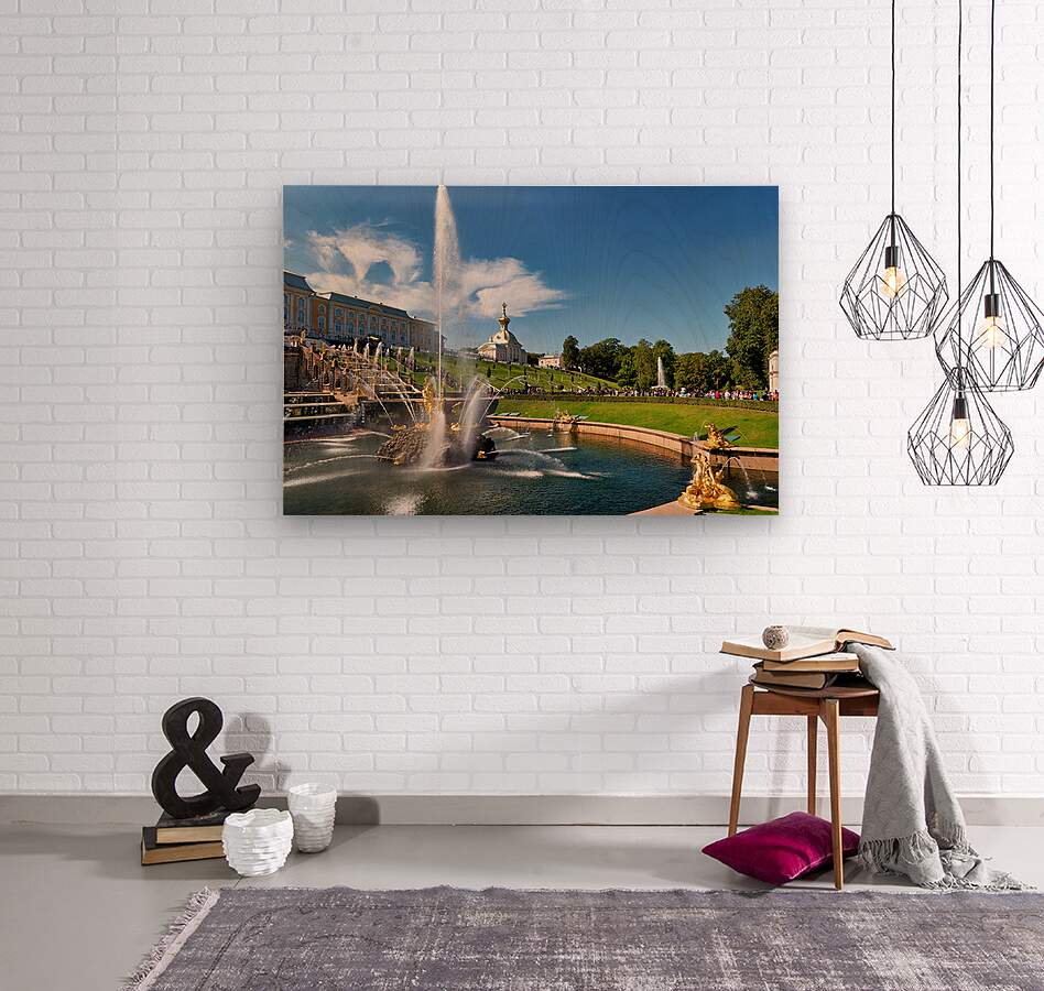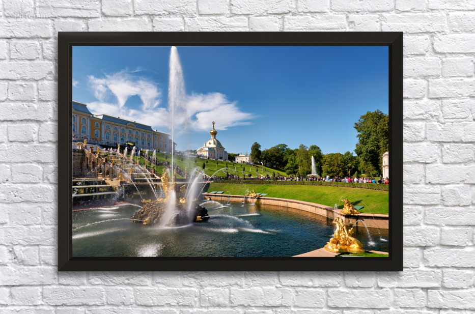 "Visitors admire the fountains at Peterhof Palace" dans une impression encadrée.