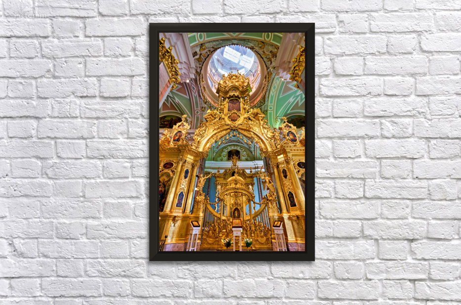 The golden altar stands in the Peter and Paul Cathedral. Visitors admire the details and craftsmanship in St. Petersburg Russia.