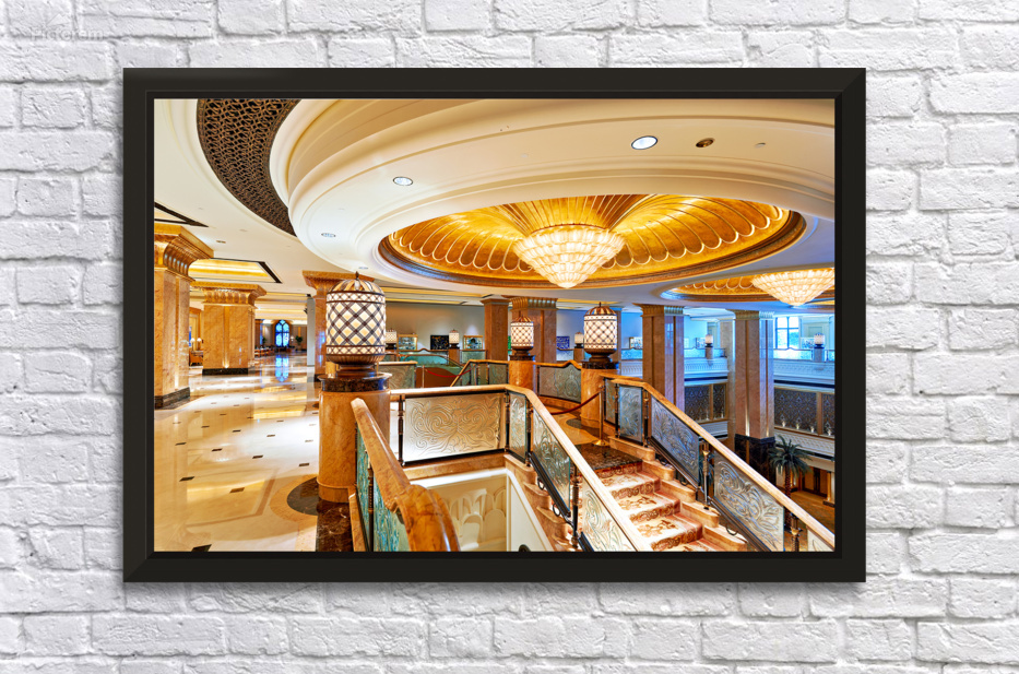 Guests walk through the hall of Emirates Palace Hotel in Abu Dhabi. The interior shows ornate details and bright lighting throughout the space.