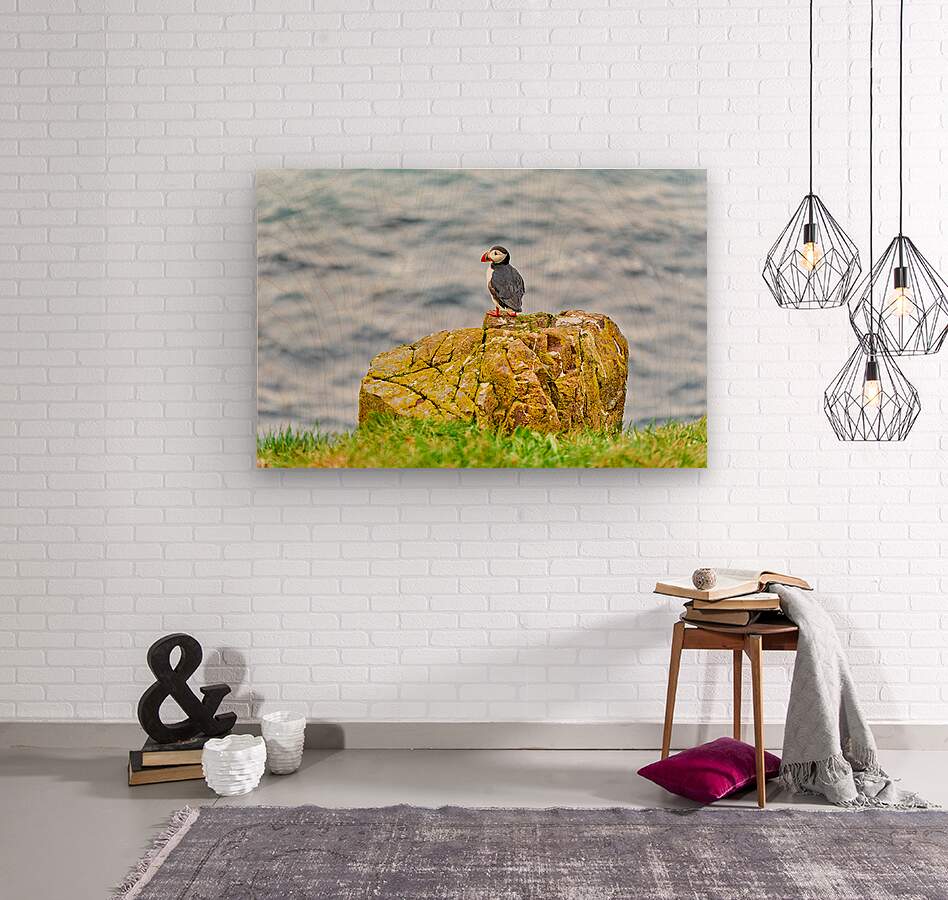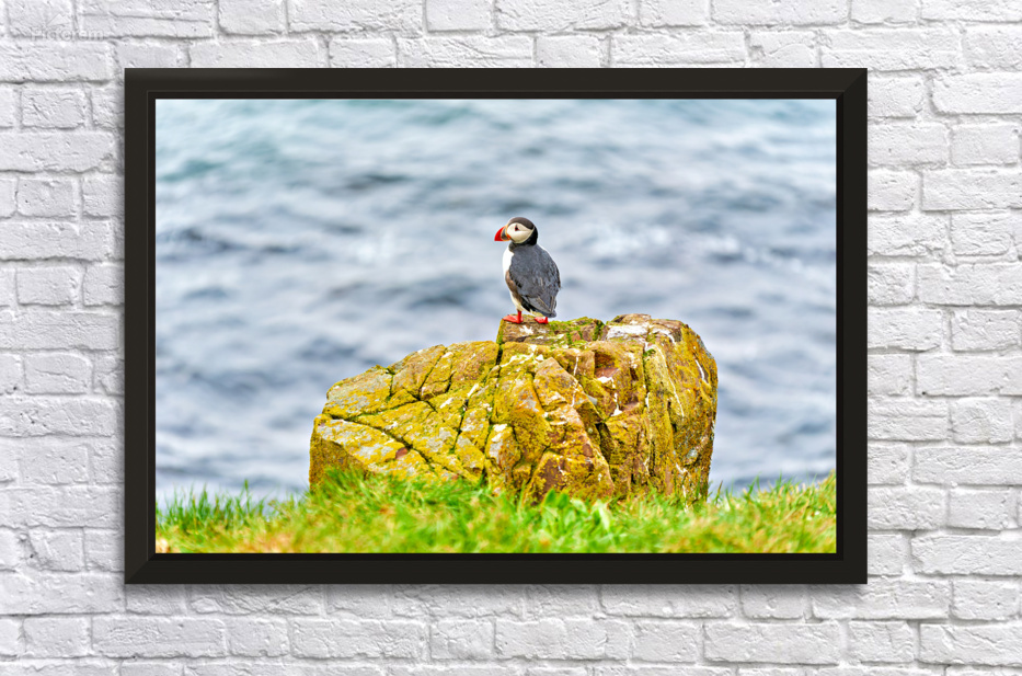 A puffin stands on a rock edge looking out at the ocean in Borgarfjordur Eystri Iceland during a bright day.