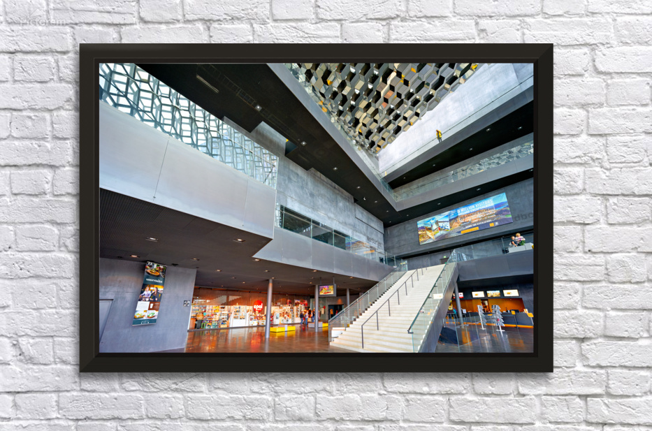 Visitors walk through the Harpa Opera House in Reykjavik. The unique architecture features large windows and a spacious interior.