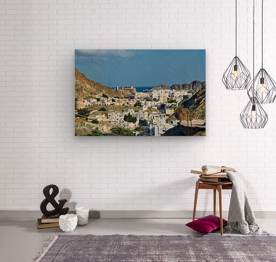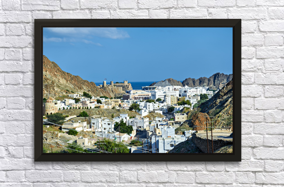 The picture shows the cityscape of Muscat Oman with white buildings mountains and the sea in the background under a clear sky.