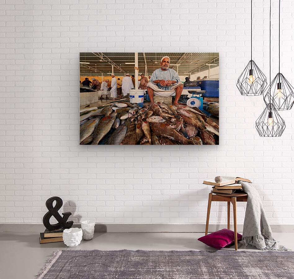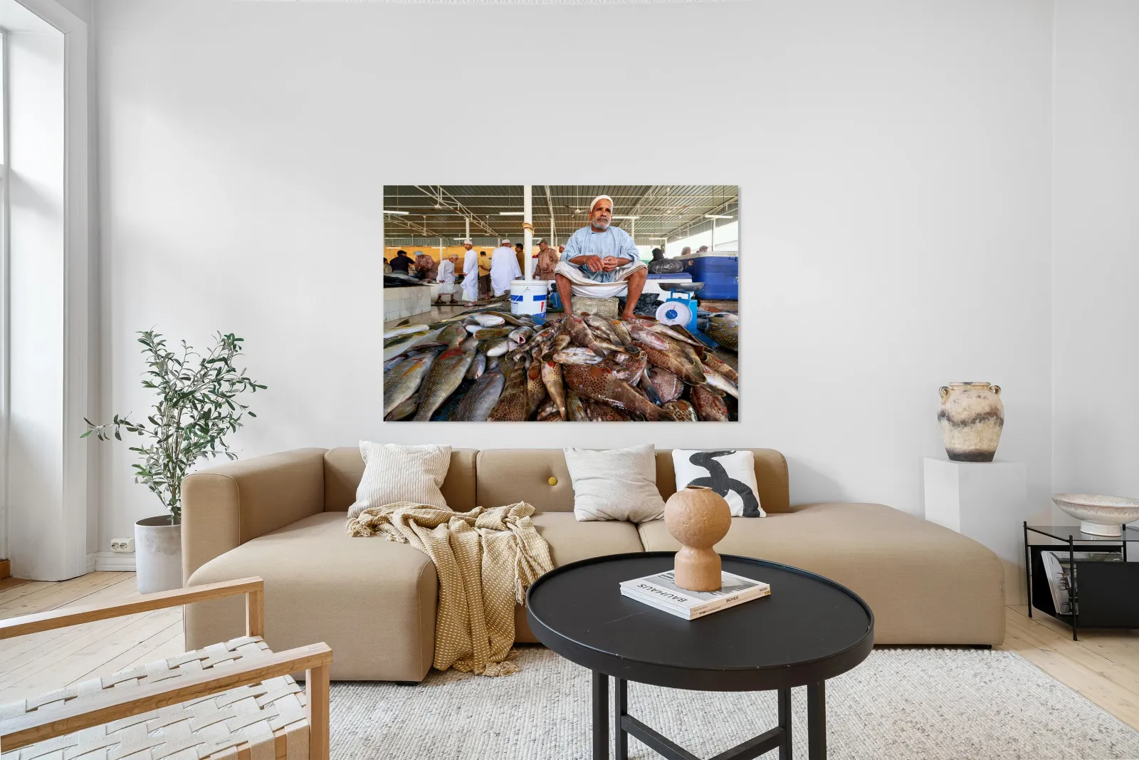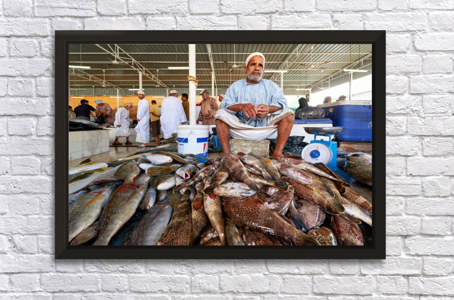 People gather at the muscat fish market in oman to buy fresh fish. A seller sits on a pile of fish showcasing the catch of the day.