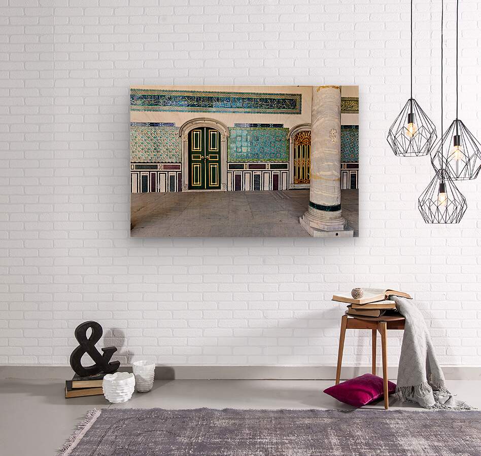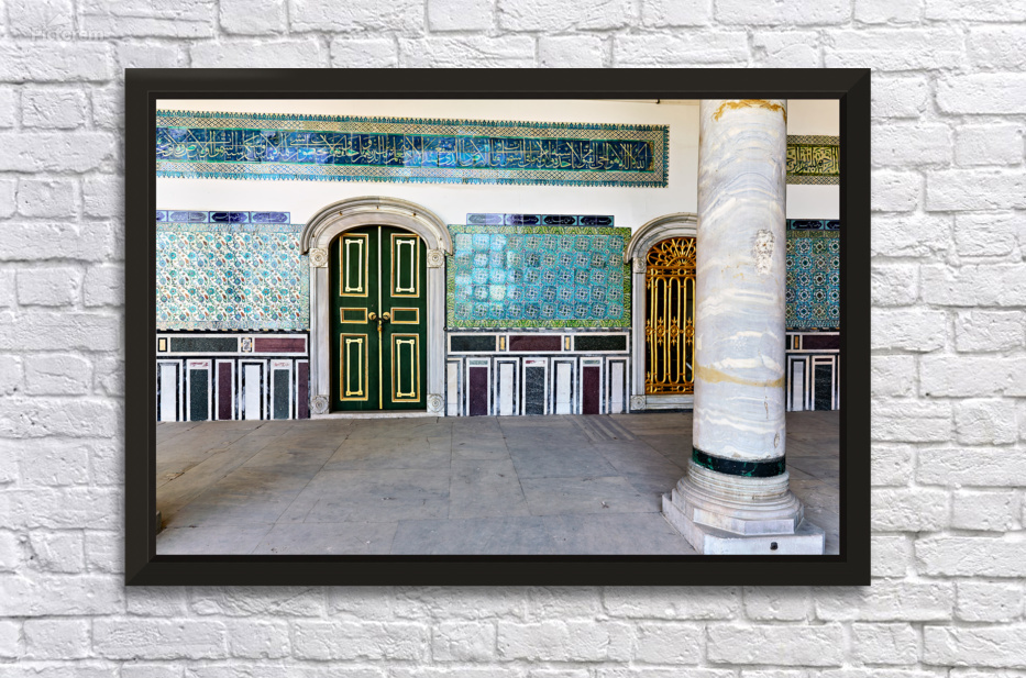 Visitors walk through a historic area of Topkapi Palace in Istanbul Turkey. The walls show colorful tiles and intricate designs around doors.