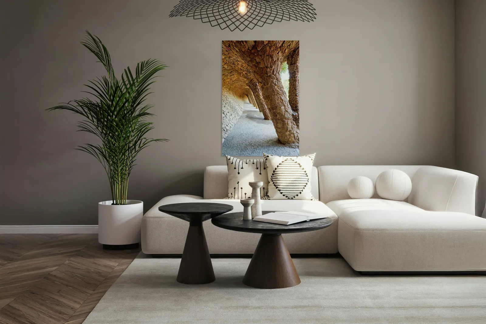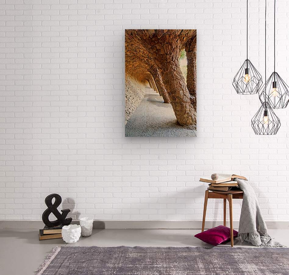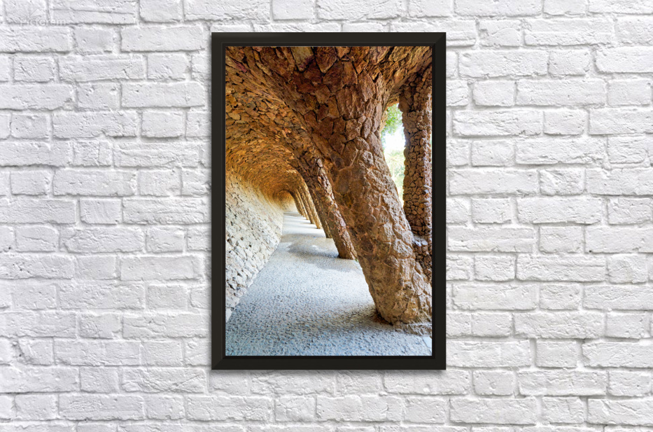 "Walking through the colonnaded pathway in Park Guell Barcelona" dans une impression encadrée.