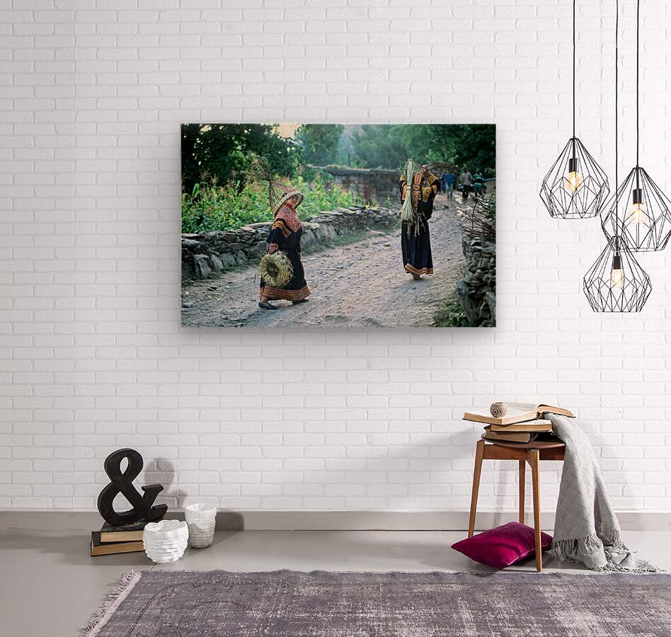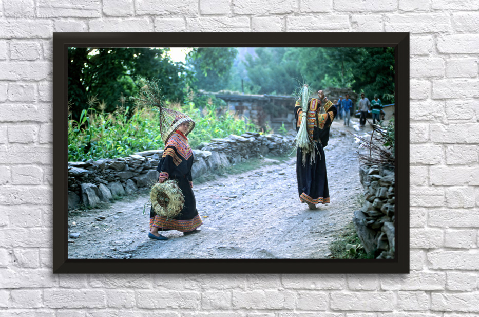 Women carry crops along the path in a Kalash village in Bumburet Valley. Daily life shows their connection to farming and tradition.