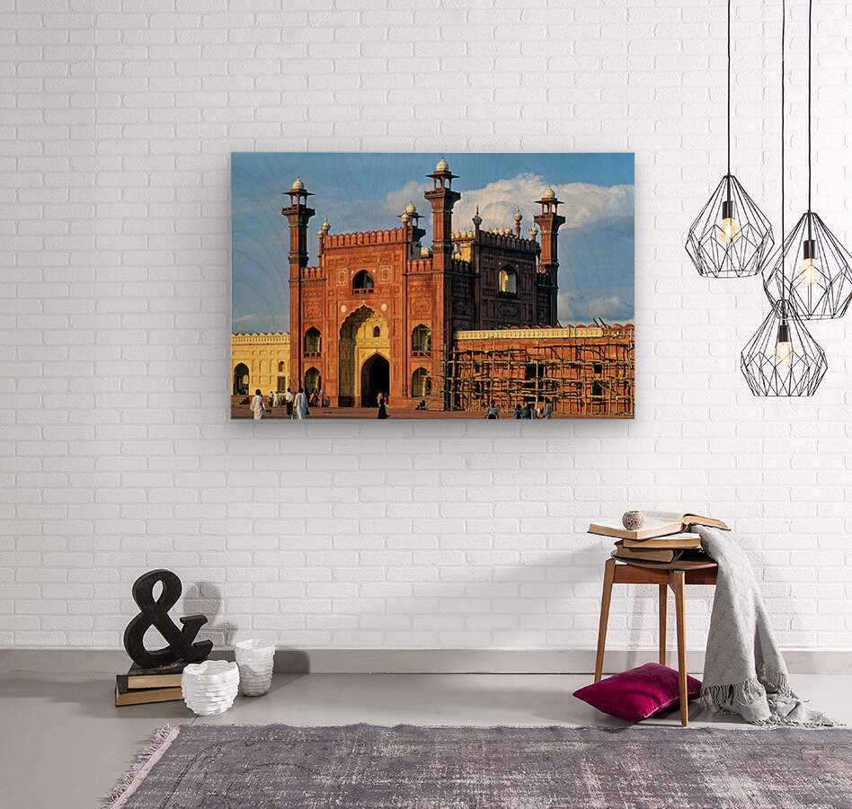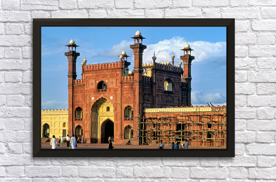 Badshahi mosque in Lahore stands tall under a blue sky. People visit and explore this famous site. Construction work is visible around the area.
