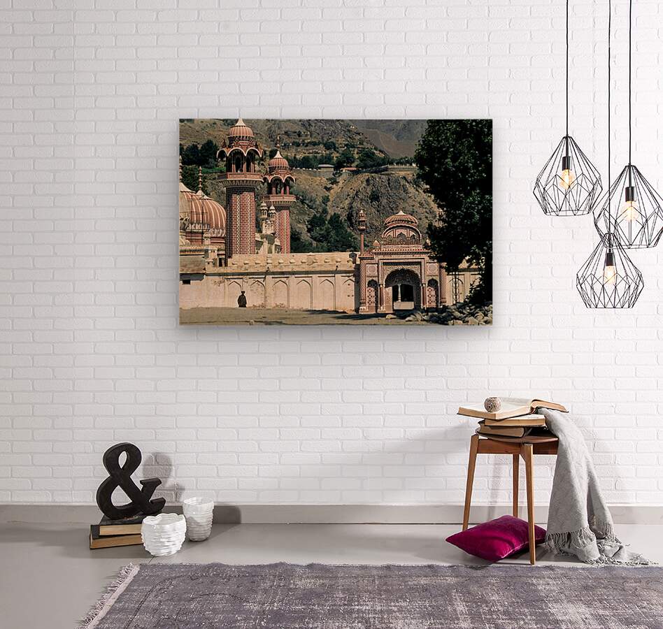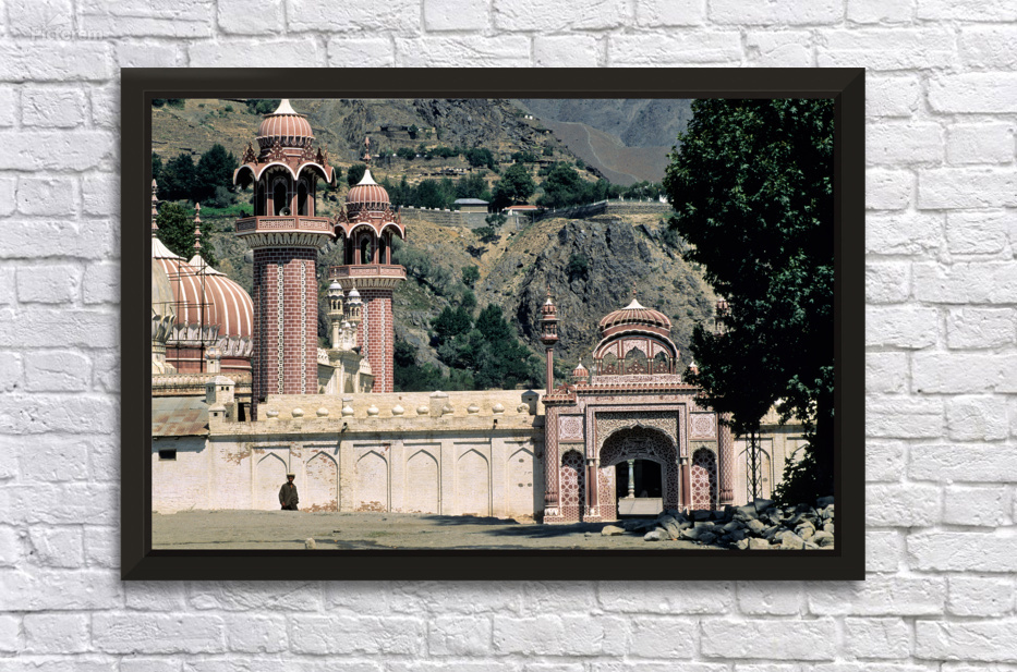 Buildings with detailed designs stand in the mountainous area of Pakistan. A figure is seen near the entrance showcasing local culture.
