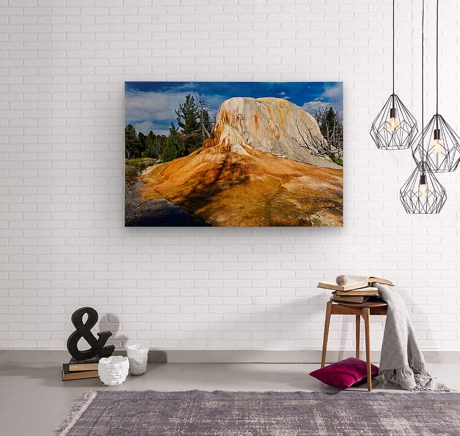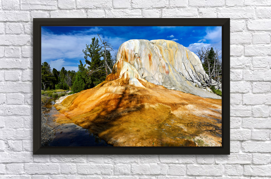 Visitors see Orange Spring Mound in Yellowstone National Park. The mound features bright colors and unique geological formations under a clear sky.