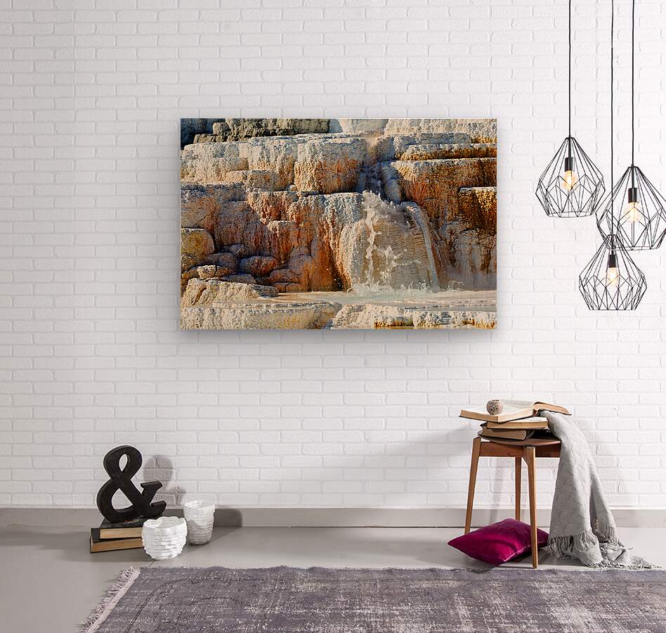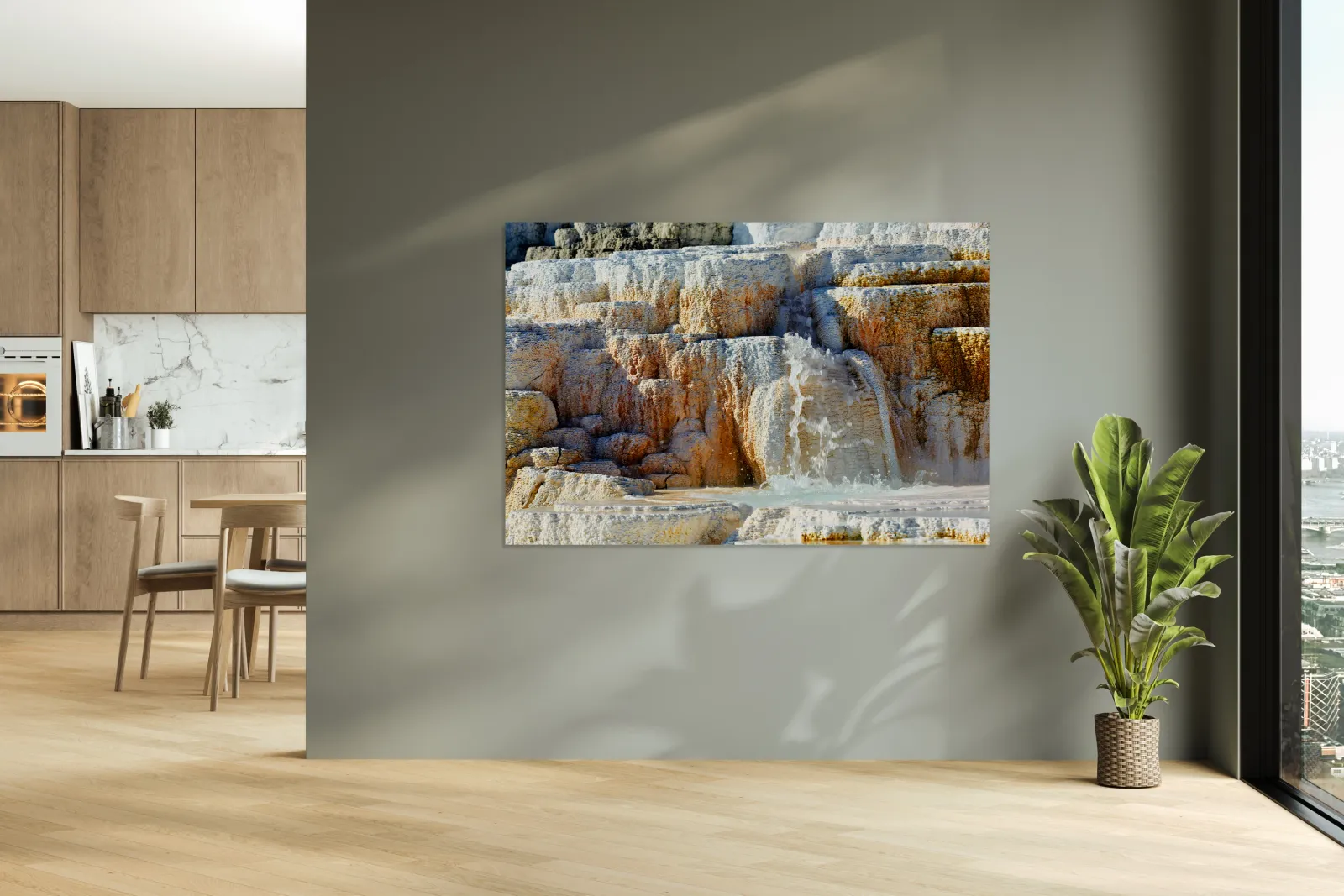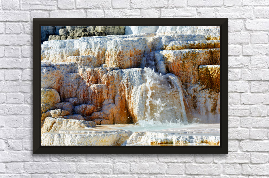 Water cascades down the terraces at Devils Thumb in Yellowstone National Park on a clear day. Visitors enjoy the natural formation.