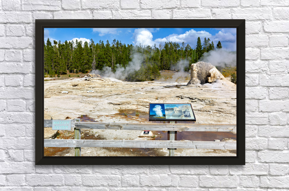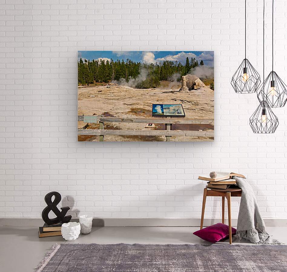 Giant Geyser erupts with steam in Yellowstone National Park. Visitors observe geyser activity near the wooden barrier.