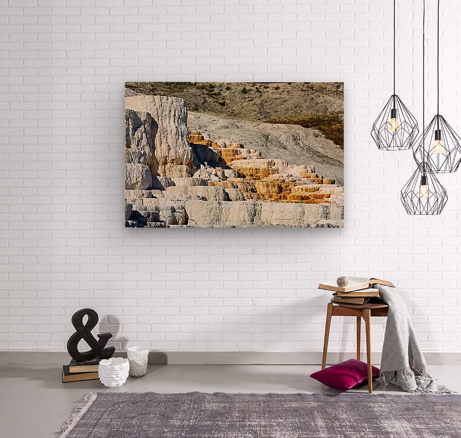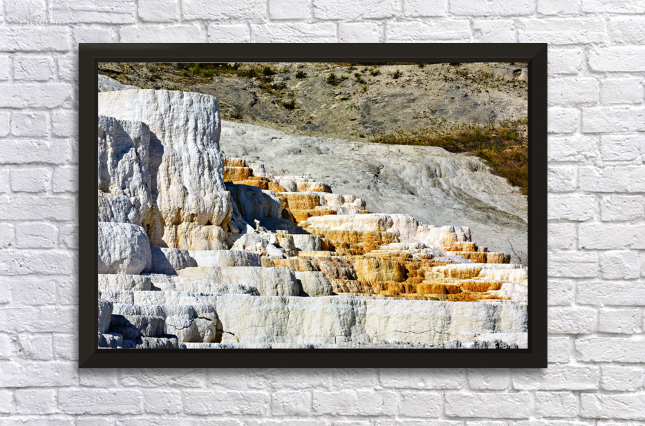 The landscape shows Devils Thumb in Yellowstone National Park with its white terraces and dry surroundings under clear sky during midday.