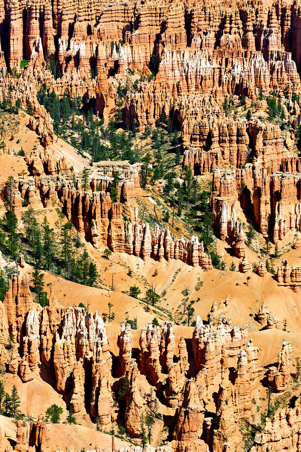 Visitors look at the rock formations in Bryce Canyon National Park from Bryce Point. Trees grow between towering cliffs under a clear sky.