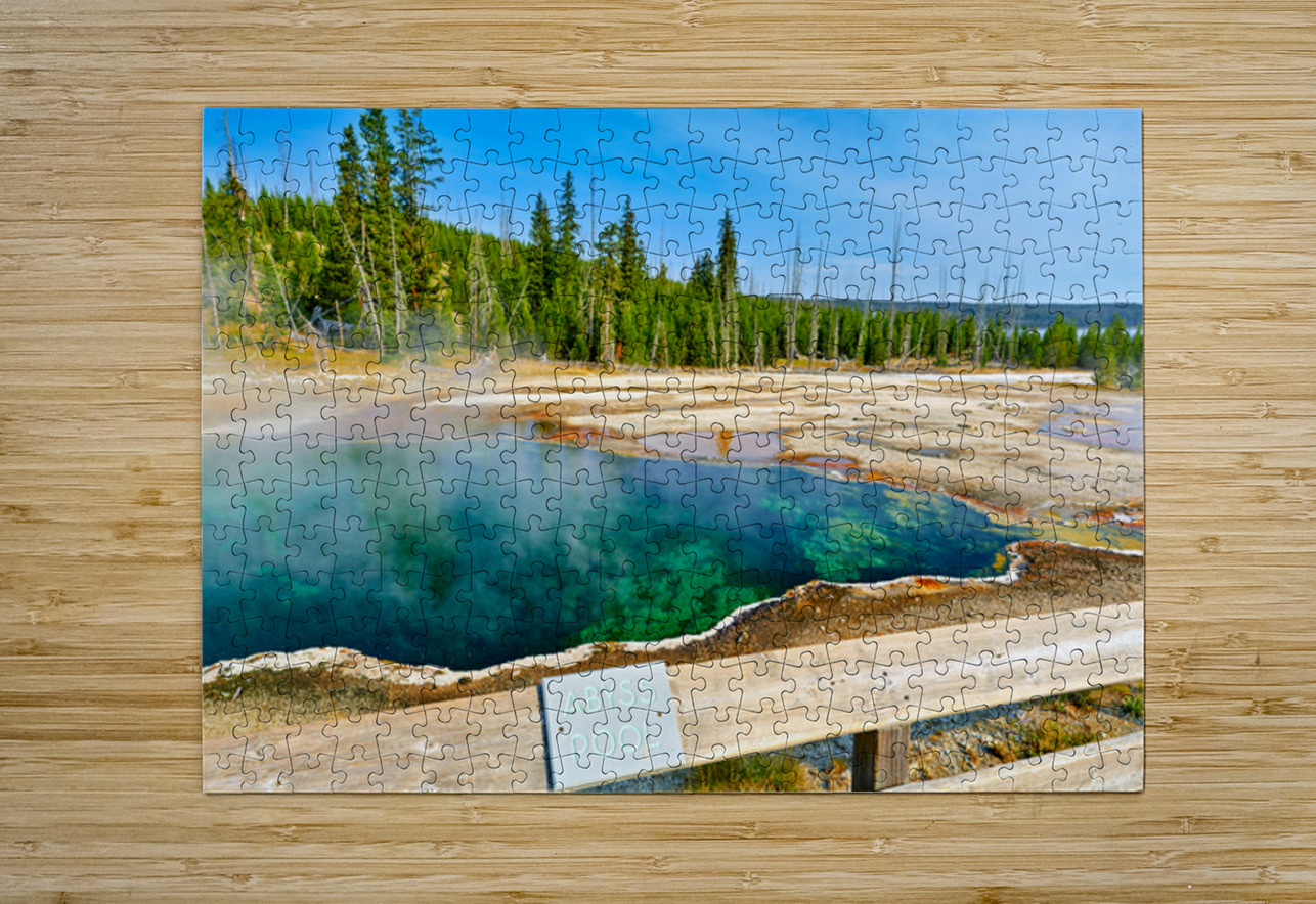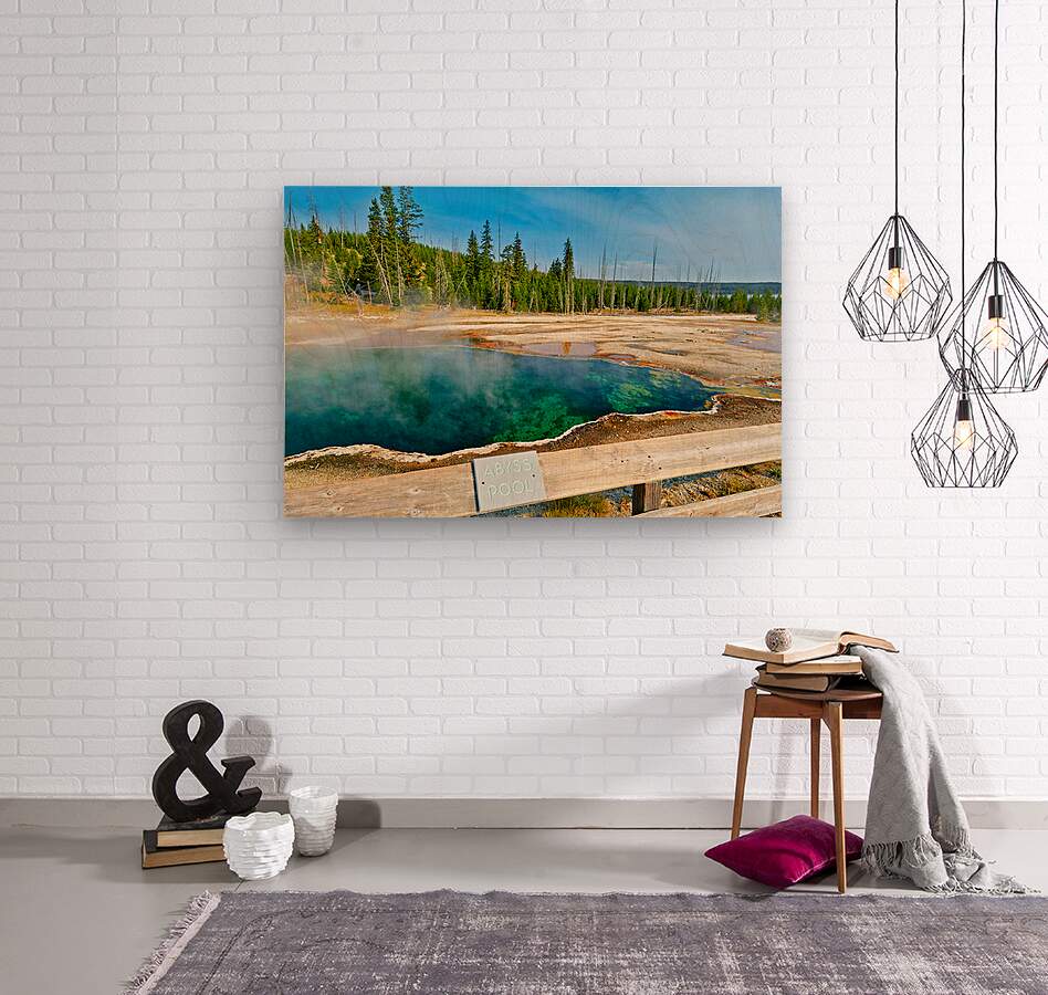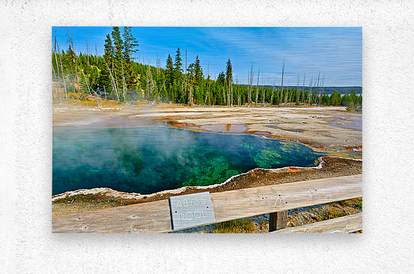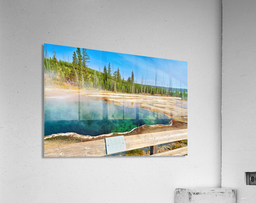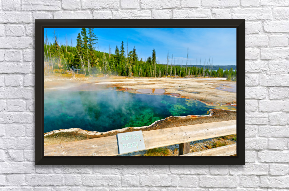 "Tourists can see the deep blue Abyss Pool in Yellowstone National Park with steam rising from the hot springs during the warm afternoon." dans une impression encadrée.