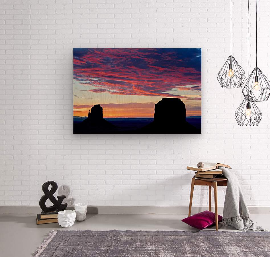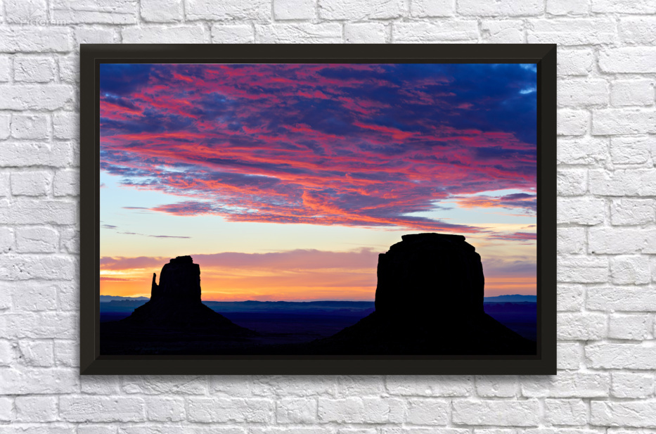 Sunset shows dark rock formations at Monument Valley with colorful clouds filling the sky and light fading in the background.
