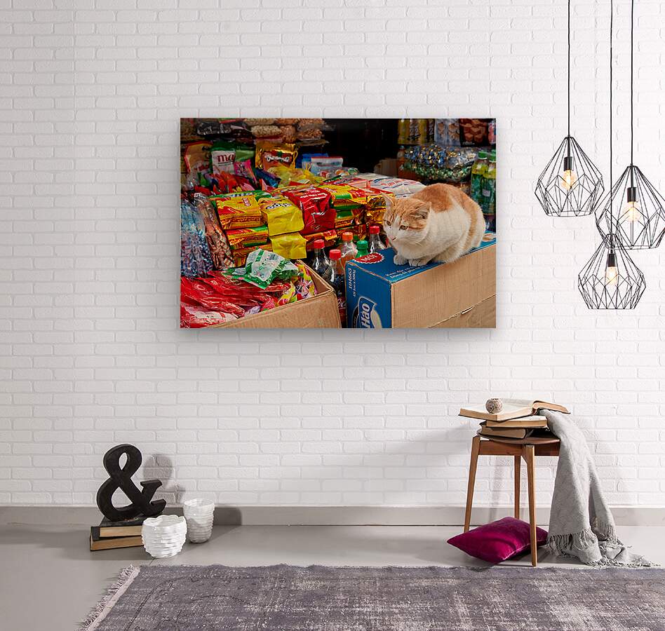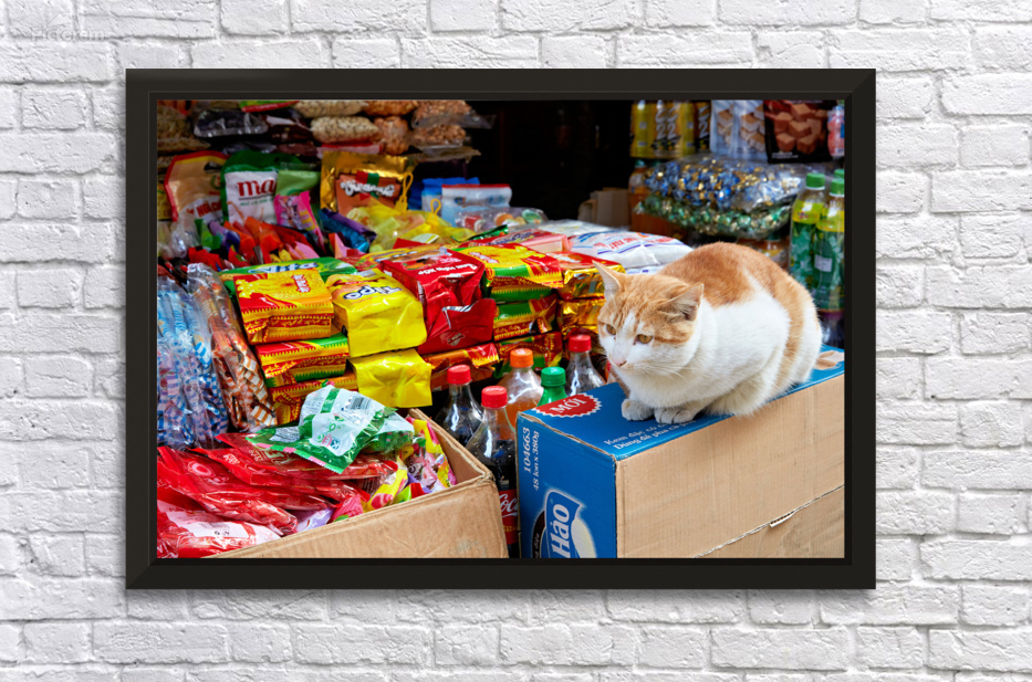A cat sits on cardboard boxes in a market in Hanoi. Surrounding it are colorful packages of snacks and drinks. People walk by.