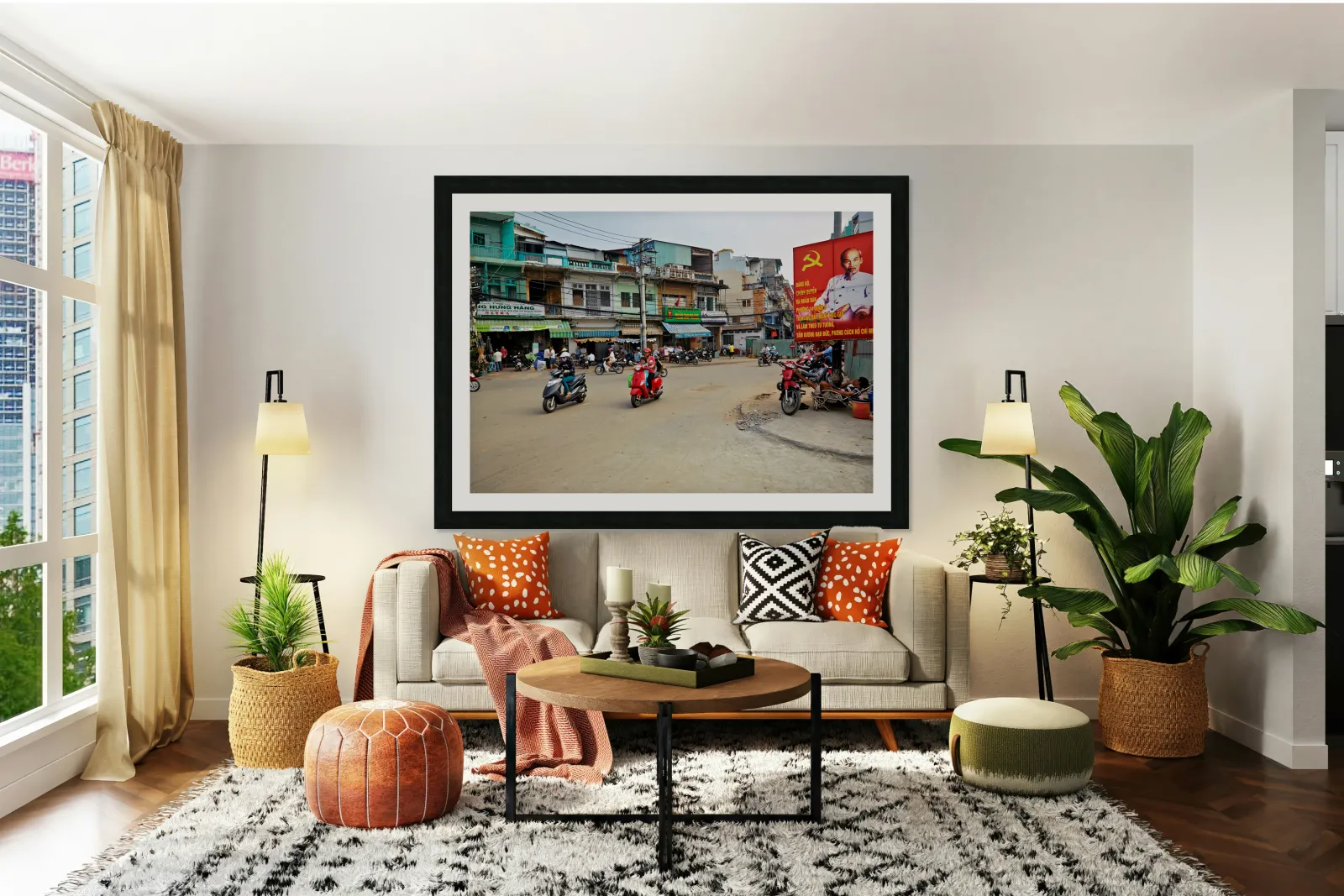 Imprimé jusqu’au bord et prêt à être accroché, avec un cadre flottant à l’arrière.