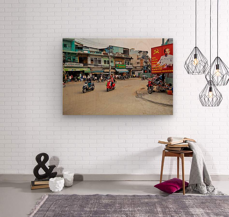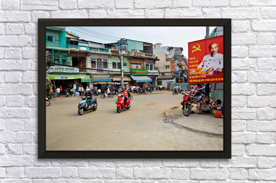 Motorbikes and cars move through a busy street in Ho Chi Minh City. Shops line the road with signs in Vietnamese visible.