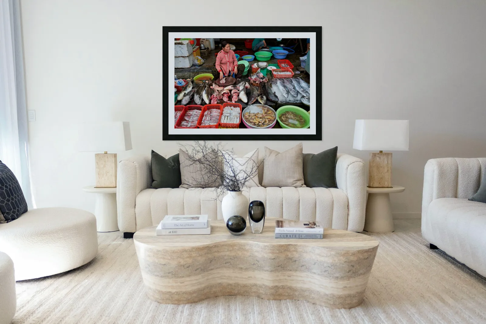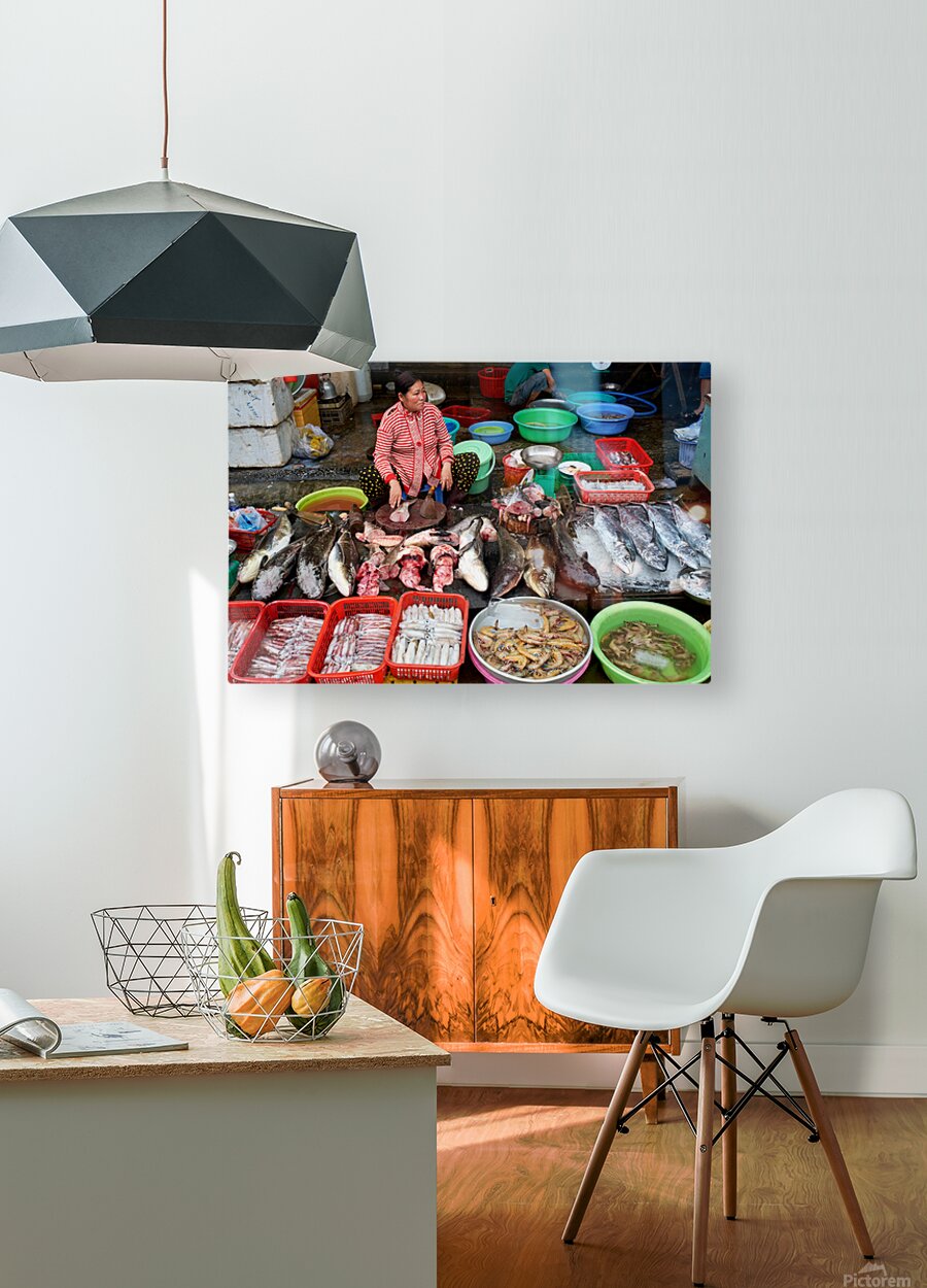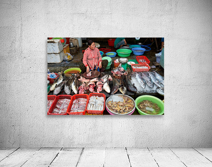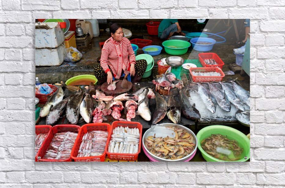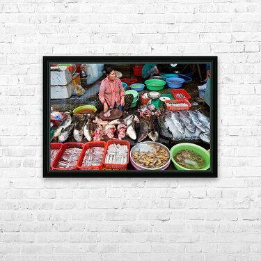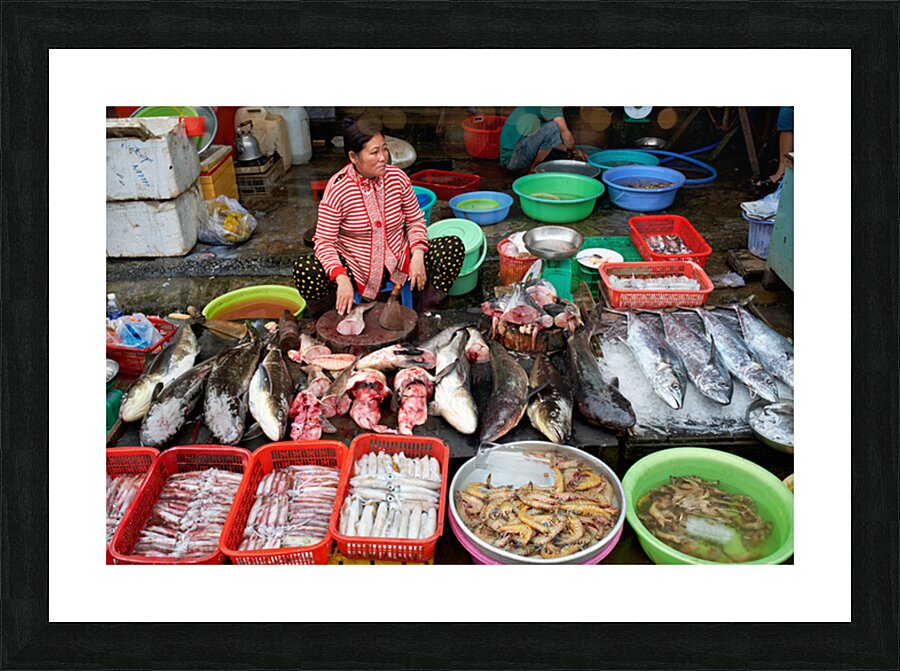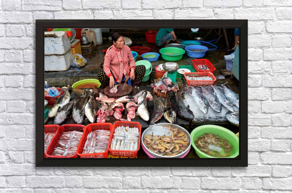 "Woman sells fish at market in Phu Quoc Vietnam during daytime" dans une impression encadrée.