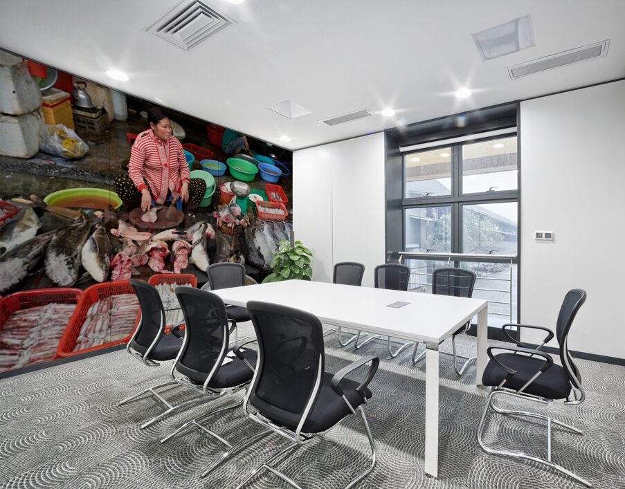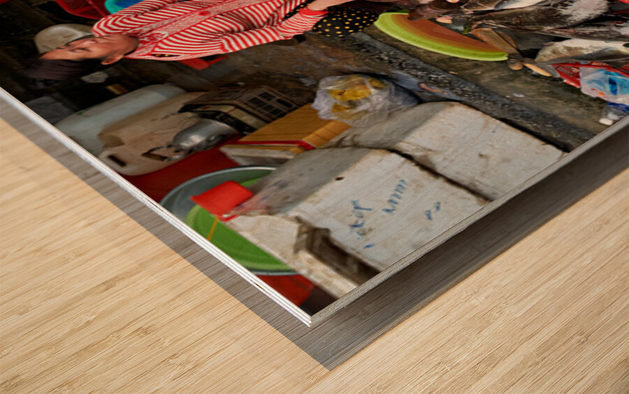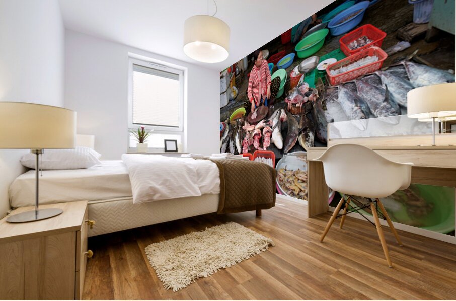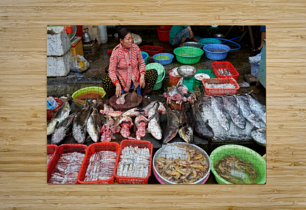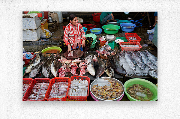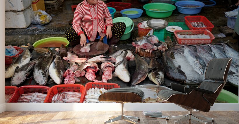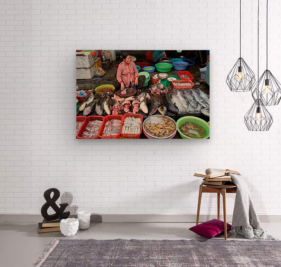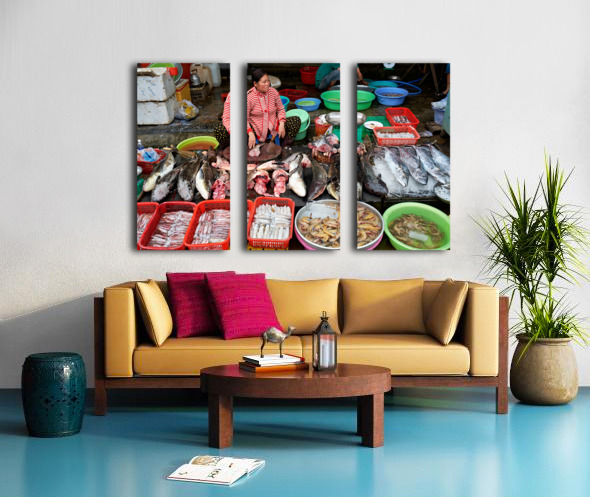 "Woman sells fish at market in Phu Quoc Vietnam during daytime" dans une impression encadrée.