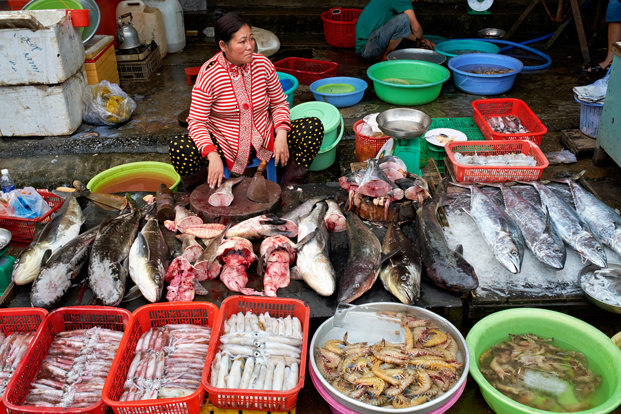 A woman sits by a stall selling fish and seafood at a busy market in Phu Quoc Vietnam surrounded by colorful baskets of fresh produce.
