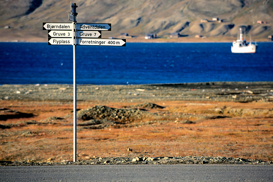 Road signs display directions to various locations in Longyearbyen. The Arctic landscape and blue water are in the background.