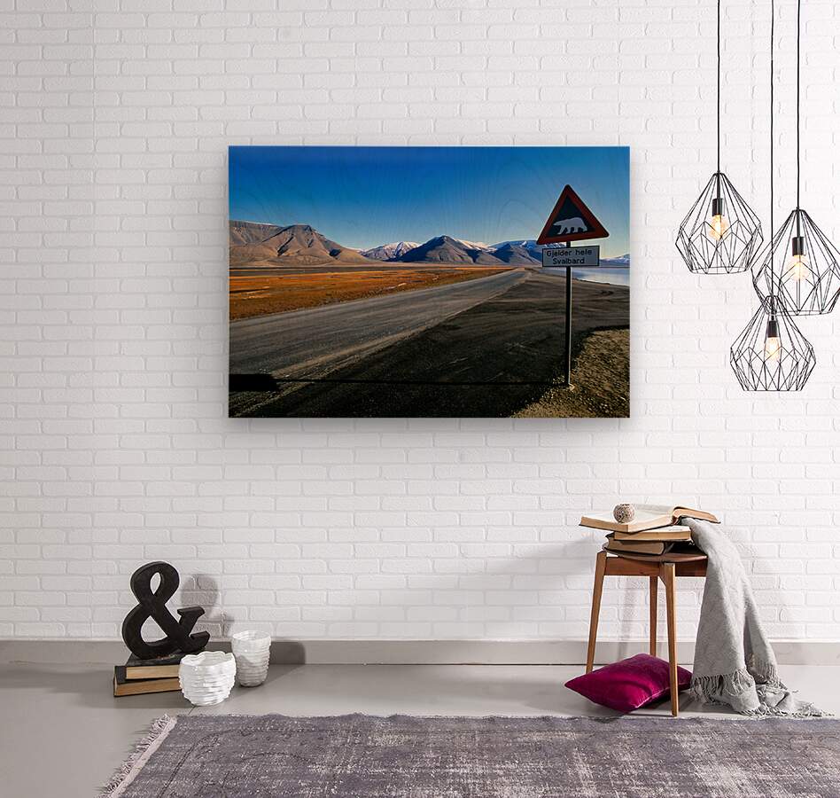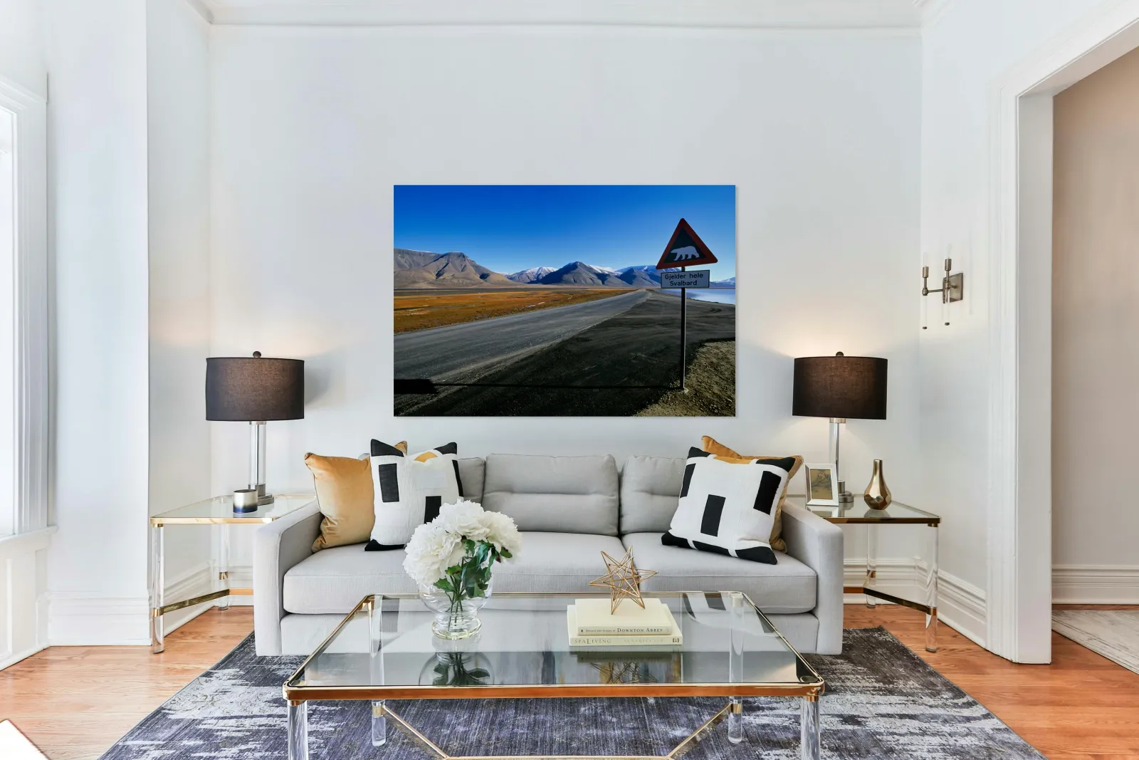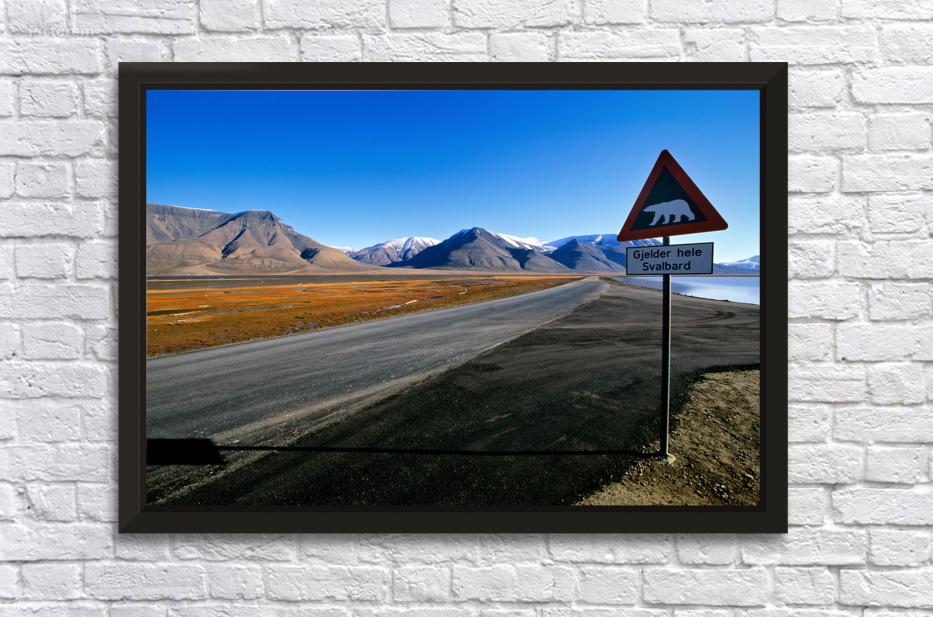 A sign warns about polar bears in Longyearbyen, Svalbard. The landscape shows mountains and a clear sky, indicating a sunny day.