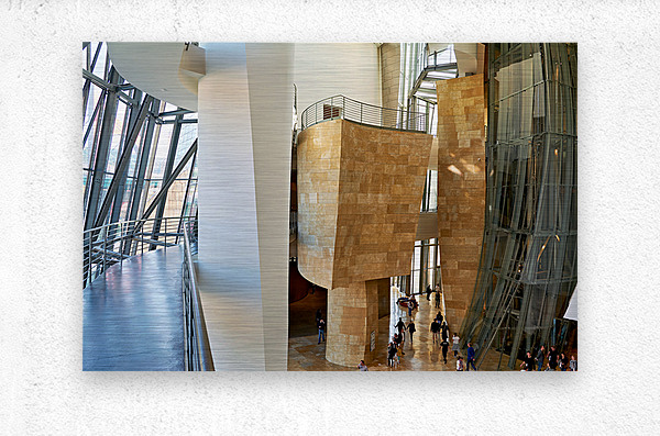 Inside Guggenheim Museum in Bilbao Spain with visitors walking Cadre photo