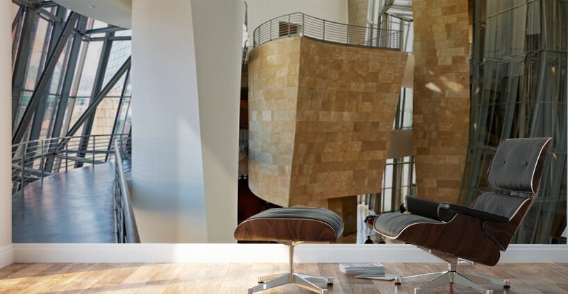People walk inside the Guggenheim Museum in Bilbao Spain. The unique architecture creates interesting shapes and large open spaces.